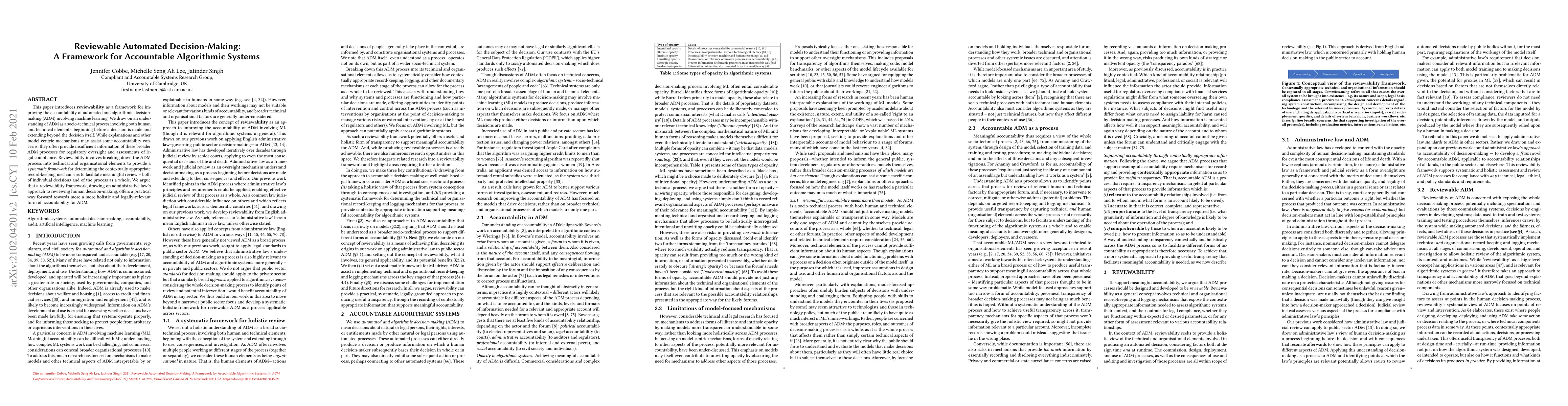 This paper proposes reviewability as a framework to enhance accountability in automated and algorithmic decision-making (ADM), emphasizing the socio-technical nature of ADM processes. It advocates for a systematic approach to record-keeping to facilitate meaningful review, drawing on administrative law to provide a more holistic and legally relevant form of accountability.