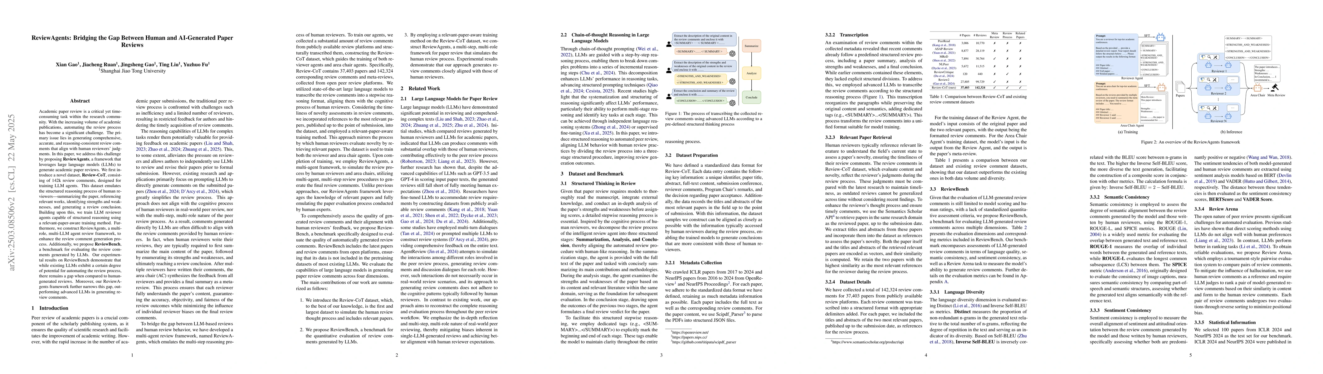 Academic paper review is a critical yet time-consuming task within the research community. With the increasing volume of academic publications, automating the review process has become a significant challenge. The primary issue lies in generating comprehensive, accurate, and reasoning-consistent review comments that align with human reviewers' judgments. In this paper, we address this challenge by proposing ReviewAgents, a framework that leverages large language models (LLMs) to generate academic paper reviews. We first introduce a novel dataset, Review-CoT, consisting of 142k review comments, designed for training LLM agents. This dataset emulates the structured reasoning process of human reviewers-summarizing the paper, referencing relevant works, identifying strengths and weaknesses, and generating a review conclusion. Building upon this, we train LLM reviewer agents capable of structured reasoning using a relevant-paper-aware training method. Furthermore, we construct ReviewAgents, a multi-role, multi-LLM agent review framework, to enhance the review comment generation process. Additionally, we propose ReviewBench, a benchmark for evaluating the review comments generated by LLMs. Our experimental results on ReviewBench demonstrate that while existing LLMs exhibit a certain degree of potential for automating the review process, there remains a gap when compared to human-generated reviews. Moreover, our ReviewAgents framework further narrows this gap, outperforming advanced LLMs in generating review comments.