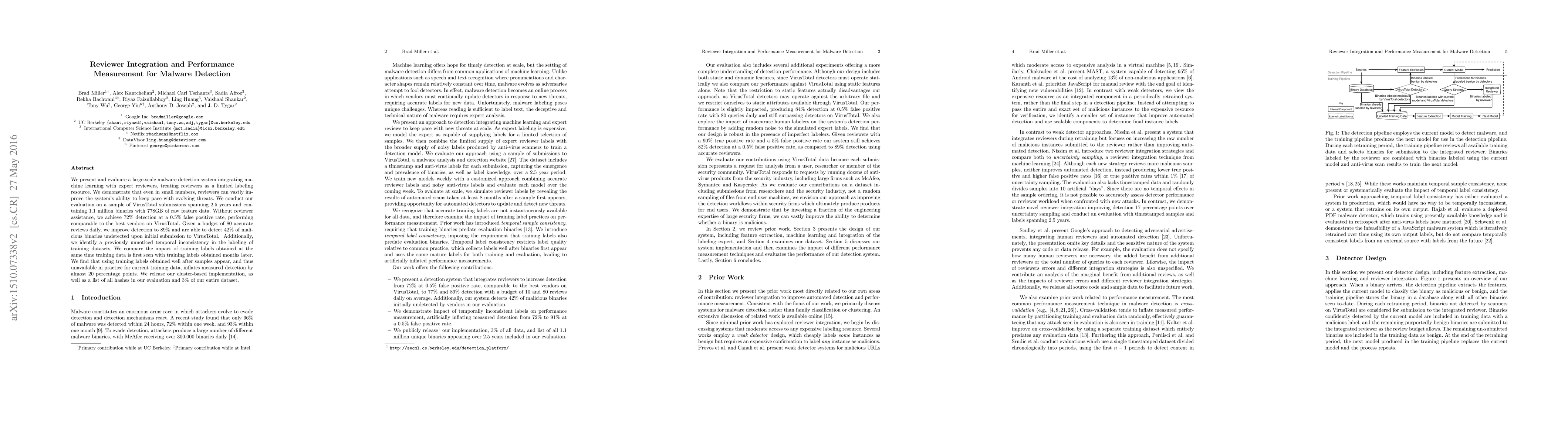 This paper presents a malware detection system that combines machine learning with expert reviewer input, showing significant improvements in detection rates when reviewers label a small number of samples. The system achieves 89% detection with 80 daily accurate reviews, identifying 42% of initially undetected malicious binaries. The study also highlights a temporal inconsistency in training dataset labeling, revealing that delayed labels inflate detection metrics by nearly 20%.