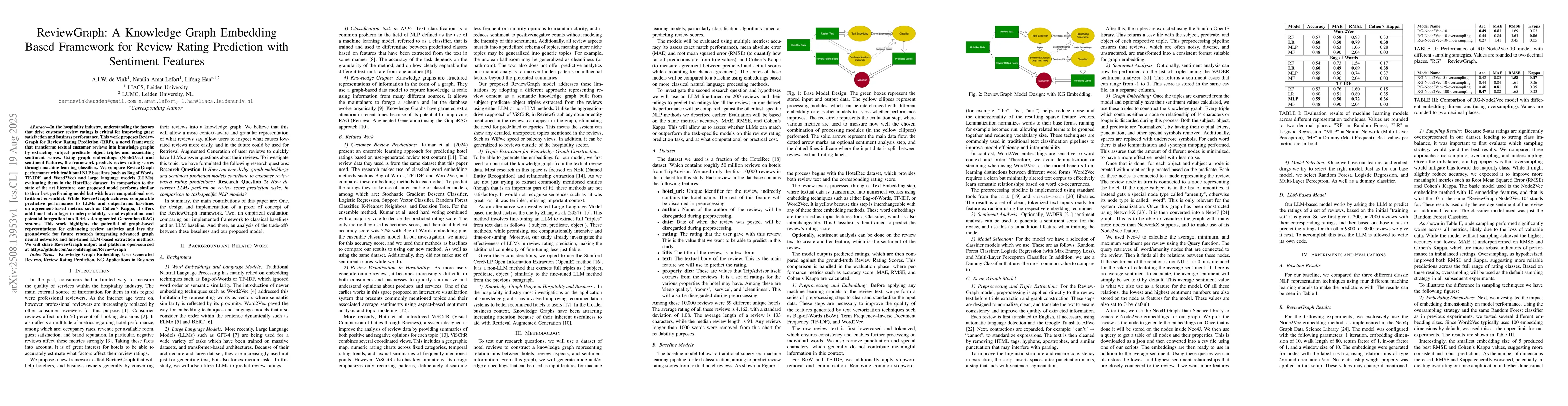 In the hospitality industry, understanding the factors that drive customer review ratings is critical for improving guest satisfaction and business performance. This work proposes ReviewGraph for Review Rating Prediction (RRP), a novel framework that transforms textual customer reviews into knowledge graphs by extracting (subject, predicate, object) triples and associating sentiment scores. Using graph embeddings (Node2Vec) and sentiment features, the framework predicts review rating scores through machine learning classifiers. We compare ReviewGraph performance with traditional NLP baselines (such as Bag of Words, TF-IDF, and Word2Vec) and large language models (LLMs), evaluating them in the HotelRec dataset. In comparison to the state of the art literature, our proposed model performs similar to their best performing model but with lower computational cost (without ensemble). While ReviewGraph achieves comparable predictive performance to LLMs and outperforms baselines on agreement-based metrics such as Cohen's Kappa, it offers additional advantages in interpretability, visual exploration, and potential integration into Retrieval-Augmented Generation (RAG) systems. This work highlights the potential of graph-based representations for enhancing review analytics and lays the groundwork for future research integrating advanced graph neural networks and fine-tuned LLM-based extraction methods. We will share ReviewGraph output and platform open-sourced on our GitHub page https://github.com/aaronlifenghan/ReviewGraph