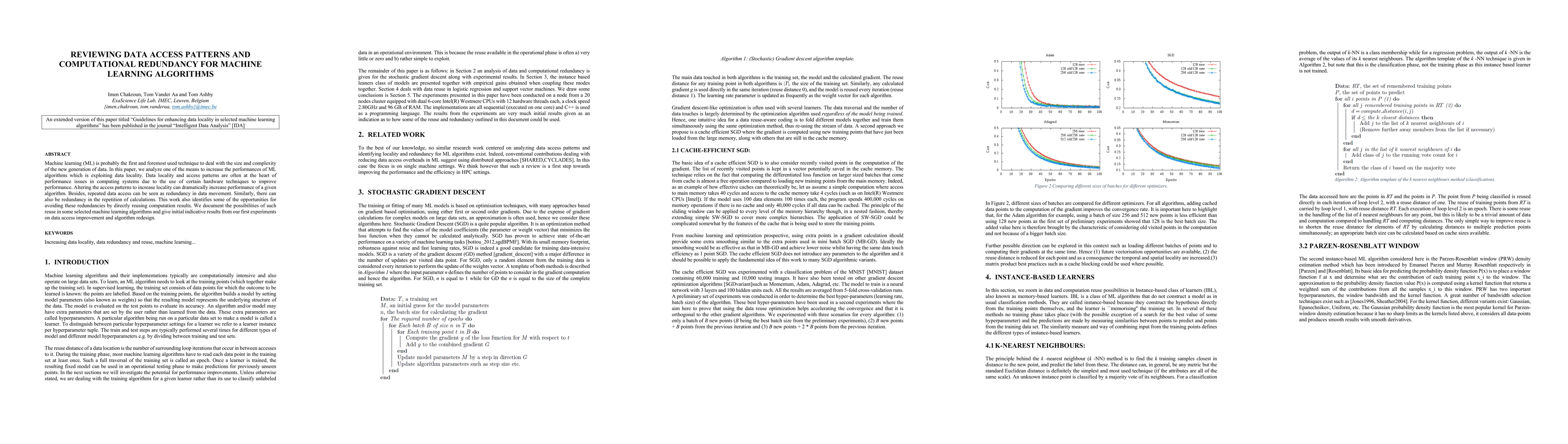 This paper investigates how optimizing data access patterns and reducing computational redundancy can enhance the performance of machine learning algorithms. It explores the benefits of data locality and identifies opportunities for avoiding redundant data movements and calculations, offering initial results from experiments on improved data access and algorithm redesign.