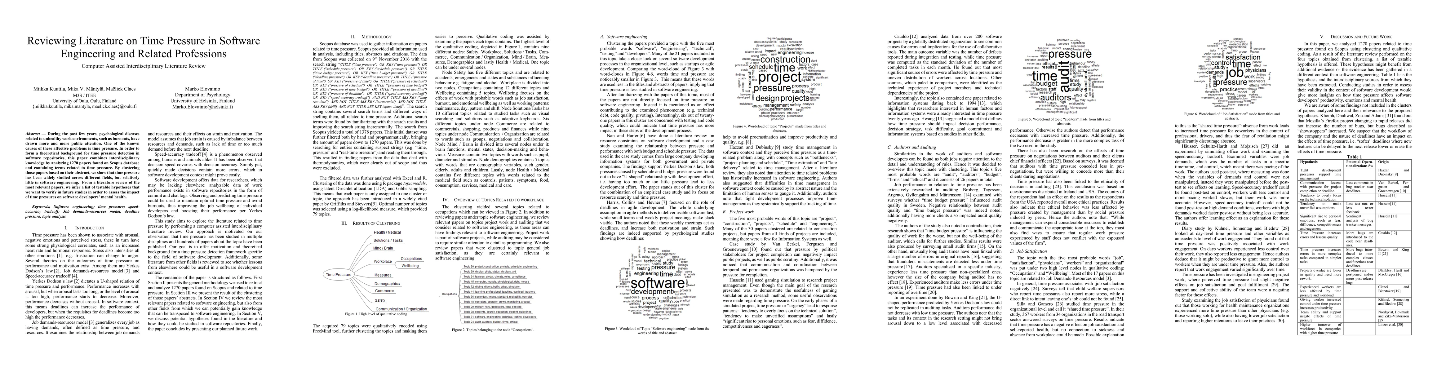 During the past years, psychological diseases related to unhealthy work environments, such as burnouts, have drawn more and more public attention. One of the known causes of these affective problems is time pressure. In order to form a theoretical background for time pressure detection in software repositories, this paper combines interdisciplinary knowledge by analyzing 1270 papers found on Scopus database and containing terms related to time pressure. By clustering those papers based on their abstract, we show that time pressure has been widely studied across different fields, but relatively little in software engineering. From a literature review of the most relevant papers, we infer a list of testable hypotheses that we want to verify in future studies in order to assess the impact of time pressures on software developers mental health.
