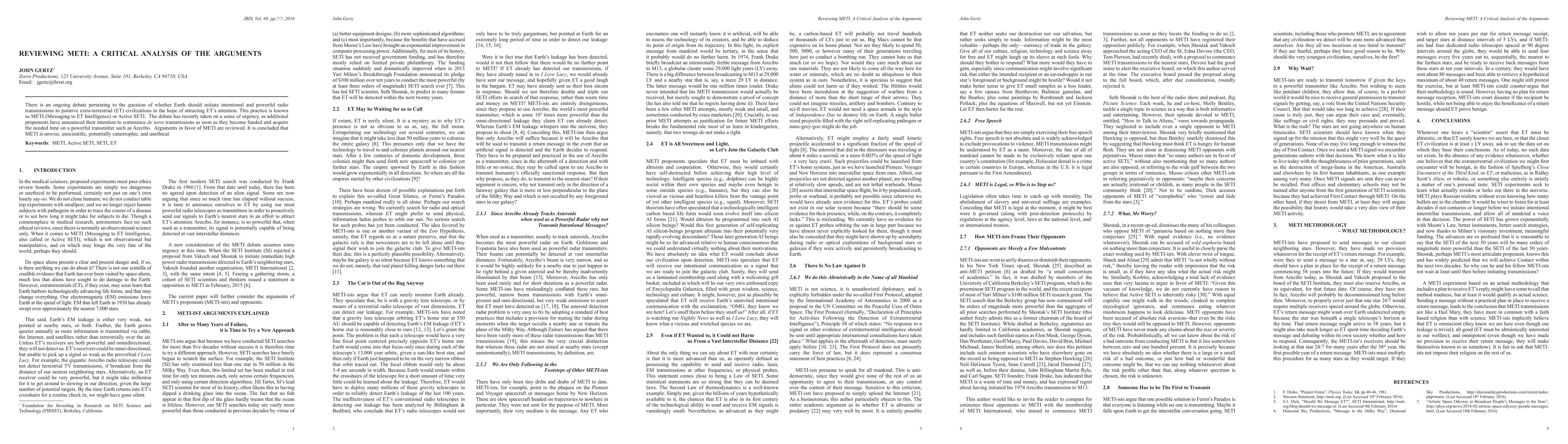 There is an ongoing debate pertaining to the question of whether Earth should initiate intentional and powerful radio transmissions to putative extra-terrestrial (ET) civilizations in the hope of attracting ET's attention. This practice is known as METI (Messaging to ET Intelligence) or Active SETI. The debate has recently taken on a sense of urgency, as additional proponents have announced their intention to commence de novo transmissions as soon as they become funded and acquire the needed time on a powerful transmitter such as Arecibo. Arguments in favor of METI are reviewed. It is concluded that METI is unwise, unscientific, potentially catastrophic, and unethical.