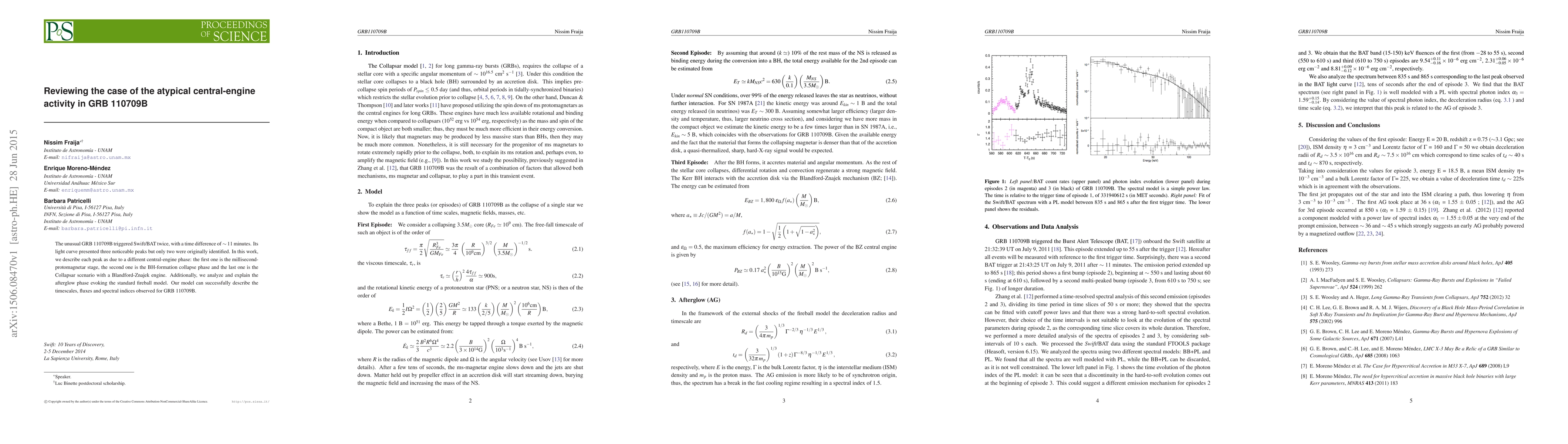 The unusual GRB 110709B triggered Swift/BAT twice, with a time difference of $\sim 11$ minutes. Its light curve presented three noticeable peaks but only two were originally identified. In this work, we describe each peak as due to a different central-engine phase: the first one is the millisecond-protomagnetar stage, the second one is the BH-formation collapse phase and the last one is the Collapsar scenario with a Blandford-Znajek engine. Additionally, we analyze and explain the afterglow phase evoking the standard fireball model. Our model can successfully describe the timescales, fluxes and spectral indices observed for GRB 110709B.
