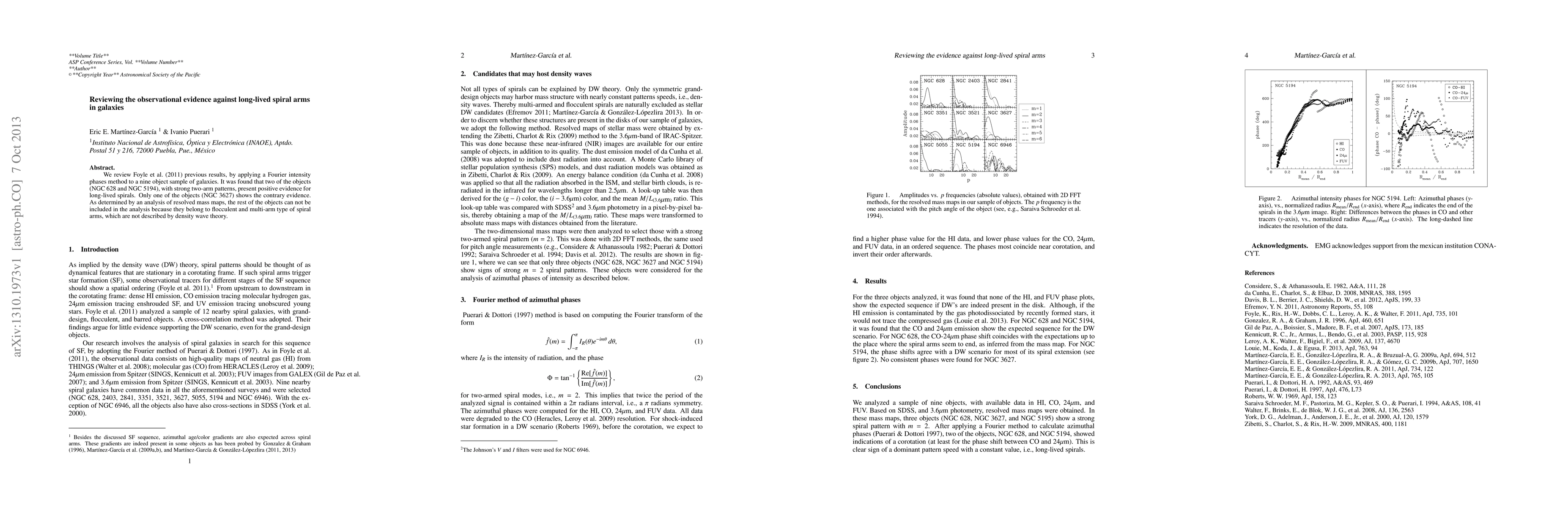 This review applies Fourier intensity phase method to nine galaxies, finding two (NGC 628 and NGC 5194) support long-lived spiral arms, while NGC 3627 opposes this. Other galaxies are classified as flocculent or multi-arm types, not fitting density wave theory.
