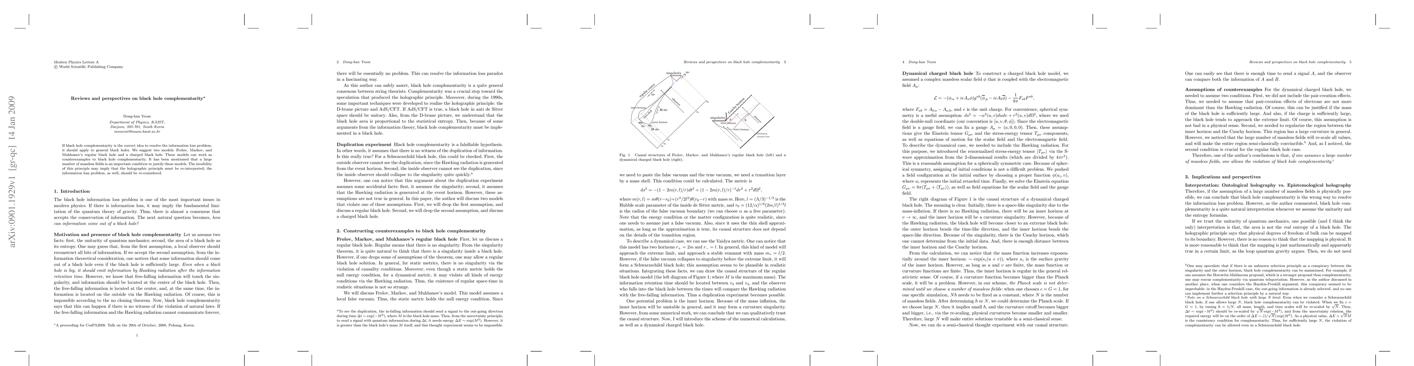 The paper examines black hole complementarity as a potential solution to the information loss paradox and tests its applicability using Frolov, Markov, and Mukhanov's regular black hole and a charged black hole model, finding they may not support the theory. It suggests that reassessing the holographic principle and the information loss problem may be necessary.