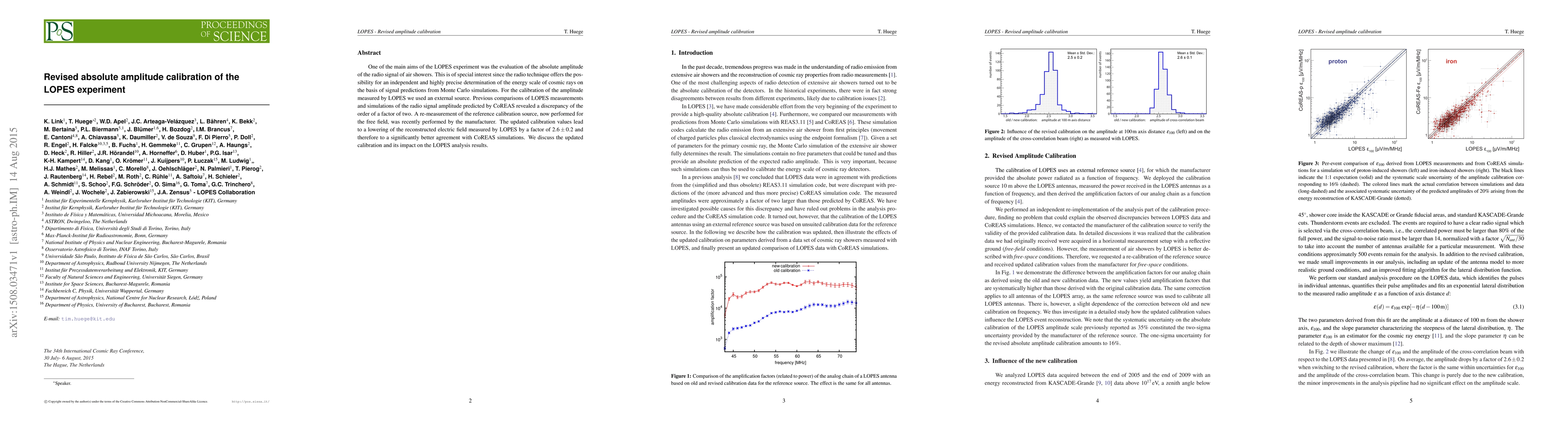 The LOPES experiment recalibrates its radio signal amplitude measurements using an updated reference source, resulting in a $2.6 \pm 0.2$ factor reduction in the electric field, which significantly improves agreement with CoREAS simulations. This revised calibration enhances the precision of cosmic ray energy scale determinations.