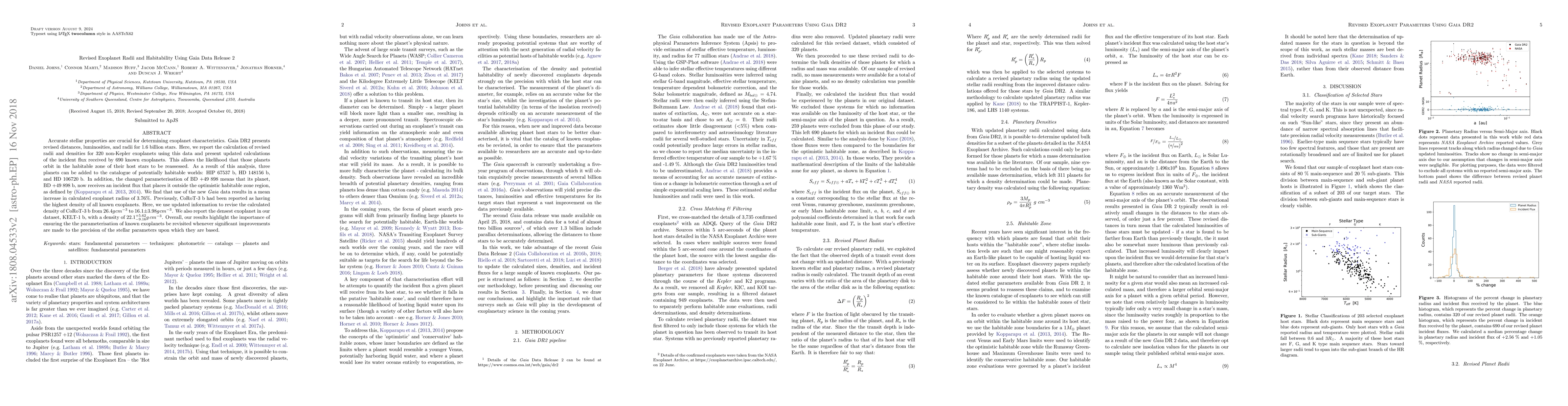 This paper revises exoplanet radii and densities using Gaia Data Release 2, finding a mean radius increase of 3.76%. Three new potentially habitable planets are identified, while BD+49 898 b is no longer considered habitable. CoRoT-3 b's density is updated, and KELT-1 b is noted as the densest exoplanet in the dataset.