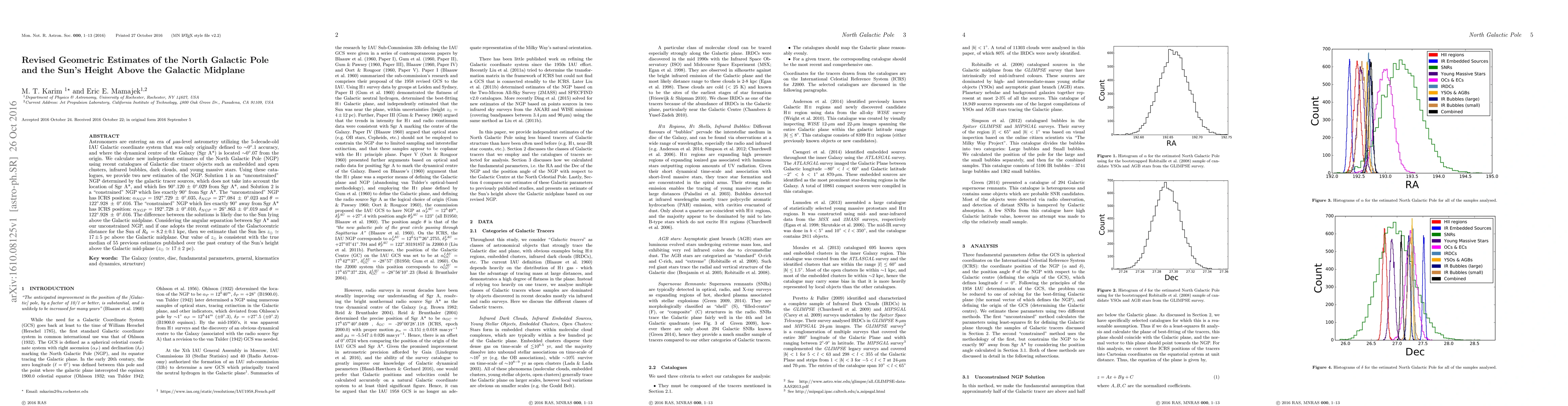 Astronomers are entering an era of {\mu}as-level astrometry utilizing the 5-decade-old IAU Galactic coordinate system that was only originally defined to $\sim$0{\deg}.1 accuracy, and where the dynamical centre of the Galaxy (Sgr A*) is located $\sim$0{\deg}.07 from the origin. We calculate new independent estimates of the North Galactic Pole (NGP) using recent catalogues of Galactic disc tracer objects such as embedded and open clusters, infrared bubbles, dark clouds, and young massive stars. Using these catalogues, we provide two new estimates of the NGP. Solution 1 is an "unconstrained" NGP determined by the galactic tracer sources, which does not take into account the location of Sgr A*, and which lies 90{\deg}.120$\,\pm\,$0{\deg}.029 from Sgr A*, and Solution 2 is a "constrained" NGP which lies exactly 90{\deg} from Sgr A*. The "unconstrained" NGP has ICRS position: $\alpha_{NGP}$ = 192{\deg}.729 $\,\pm\,$ 0{\deg}.035, $\delta_{NGP}$ = 27{\deg}.084 $\,\pm\,$ 0{\deg}.023 and $\theta\,$ = 122{\deg}.928 $\,\pm\,$ 0{\deg}.016. The "constrained" NGP which lies exactly 90{\deg} away from Sgr A* has ICRS position: $\alpha_{NGP}$ = 192{\deg}.728 $\,\pm\,$0{\deg}.010, $\delta_{NGP}$ = 26{\deg}.863 $\,\pm\,$ 0{\deg}.019 and $\theta\,$ = 122{\deg}.928 $\,\pm\,$ 0{\deg}.016. The difference between the solutions is likely due to the Sun lying above the Galactic midplane. Considering the angular separation between Sgr A* and our unconstrained NGP, and if one adopts the recent estimate of the Galactocentric distance for the Sun of $R_{0}$ = 8.2$\,\pm\,$0.1 kpc, then we estimate that the Sun lies $z_{\odot}$ $\simeq$ 17$\,\pm\,$5 pc above the Galactic midplane. Our value of $z_{\odot}$ is consistent with the true median of 55 previous estimates published over the past century of the Sun's height above the Galactic mid-plane ($z_{\odot}$ $\simeq$ 17$\,\pm\,$2 pc).