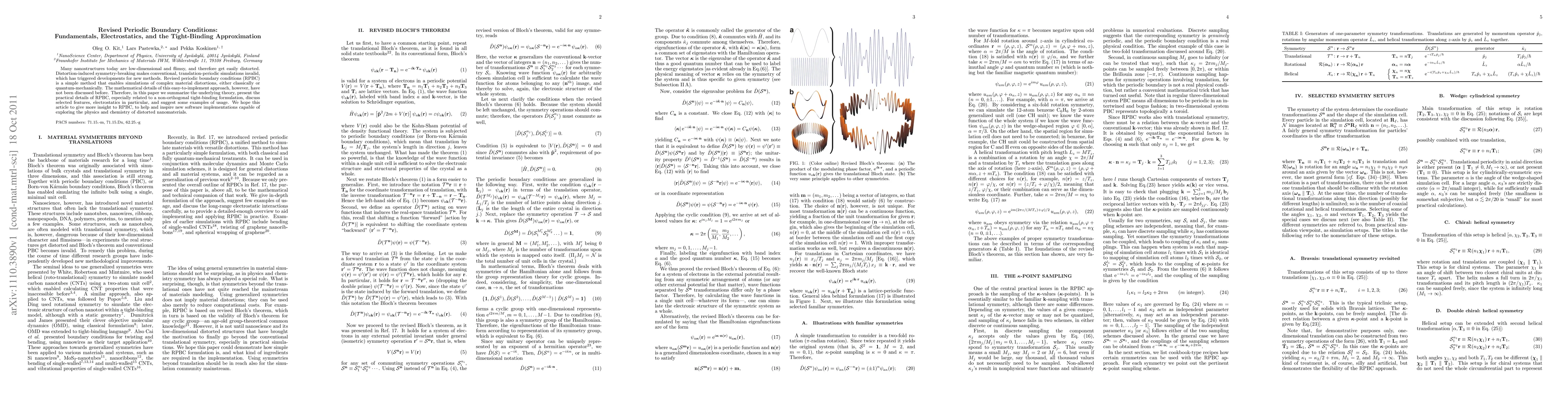 Many nanostructures today are low-dimensional and flimsy, and therefore get easily distorted. Distortion-induced symmetry-breaking makes conventional, translation-periodic simulations invalid, which has triggered developments for new methods. Revised periodic boundary conditions (RPBC) is a simple method that enables simulations of complex material distortions, either classically or quantum-mechanically. The mathematical details of this easy-to-implement approach, however, have not been discussed before. Therefore, in this paper we summarize the underlying theory, present the practical details of RPBC, especially related to a non-orthogonal tight-binding formulation, discuss selected features, electrostatics in particular, and suggest some examples of usage. We hope this article to give more insight to RPBC, to help and inspire new software implementations capable of exploring the physics and chemistry of distorted nanomaterials.