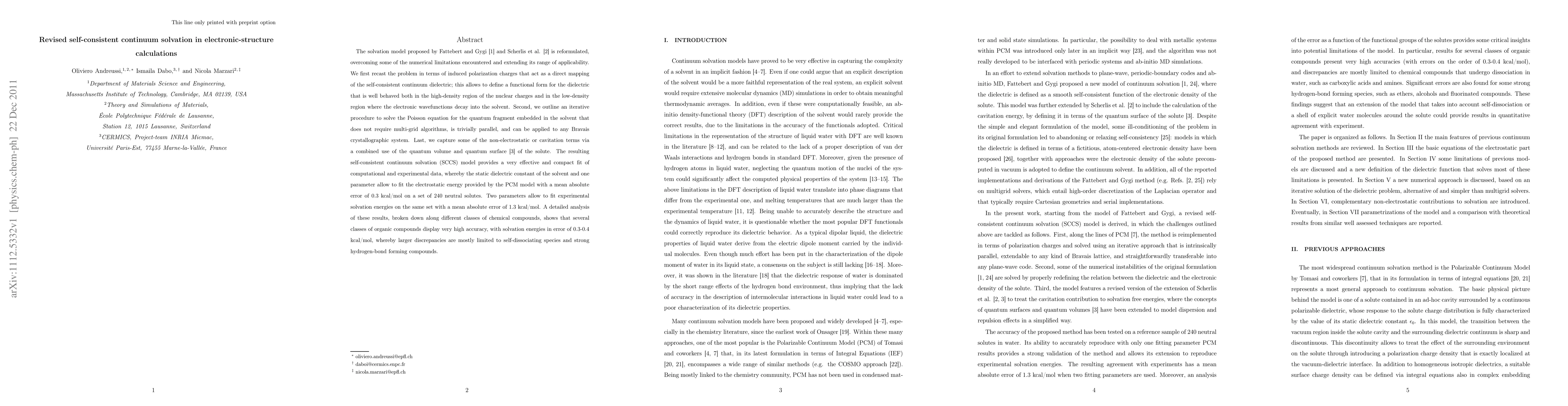 The solvation model proposed by Fattebert and Gygi [Journal of Computational Chemistry 23, 662 (2002)] and Scherlis et al. [Journal of Chemical Physics 124, 074103 (2006)] is reformulated, overcoming some of the numerical limitations encountered and extending its range of applicability. We first recast the problem in terms of induced polarization charges that act as a direct mapping of the self-consistent continuum dielectric; this allows to define a functional form for the dielectric that is well behaved both in the high-density region of the nuclear charges and in the low-density region where the electronic wavefunctions decay into the solvent. Second, we outline an iterative procedure to solve the Poisson equation for the quantum fragment embedded in the solvent that does not require multi-grid algorithms, is trivially parallel, and can be applied to any Bravais crystallographic system. Last, we capture some of the non-electrostatic or cavitation terms via a combined use of the quantum volume and quantum surface [Physical Review Letters 94, 145501 (2005)] of the solute. The resulting self-consistent continuum solvation (SCCS) model provides a very effective and compact fit of computational and experimental data, whereby the static dielectric constant of the solvent and one parameter allow to fit the electrostatic energy provided by the PCM model with a mean absolute error of 0.3 kcal/mol on a set of 240 neutral solutes. Two parameters allow to fit experimental solvation energies on the same set with a mean absolute error of 1.3 kcal/mol. A detailed analysis of these results, broken down along different classes of chemical compounds, shows that several classes of organic compounds display very high accuracy, with solvation energies in error of 0.3-0.4 kcal/mol, whereby larger discrepancies are mostly limited to self-dissociating species and strong hydrogen-bond forming compounds.