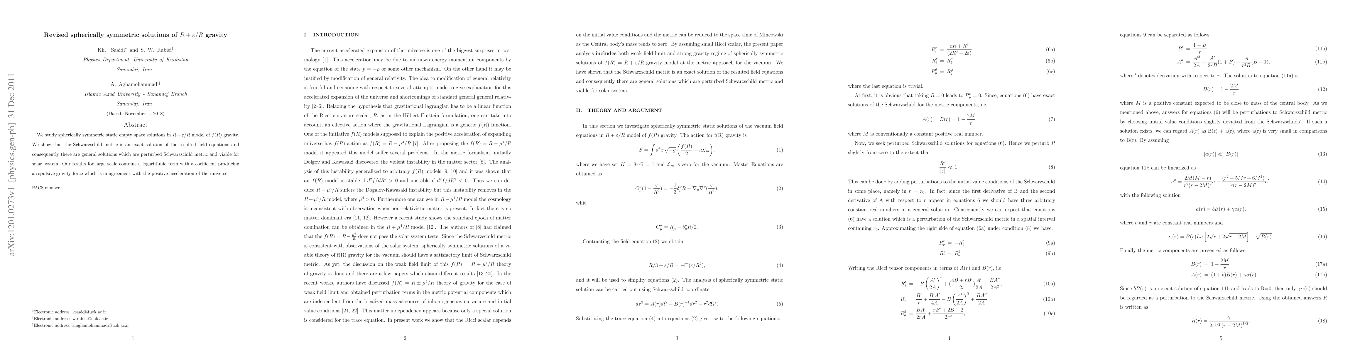 This paper investigates spherically symmetric static solutions in $R+\varepsilon/R$ gravity, demonstrating that the Schwarzschild metric is an exact solution. It also presents general solutions that are perturbations of the Schwarzschild metric, viable for solar system conditions, and includes a logarithmic term for large scales that supports repulsive gravity aligning with the universe's positive acceleration.
