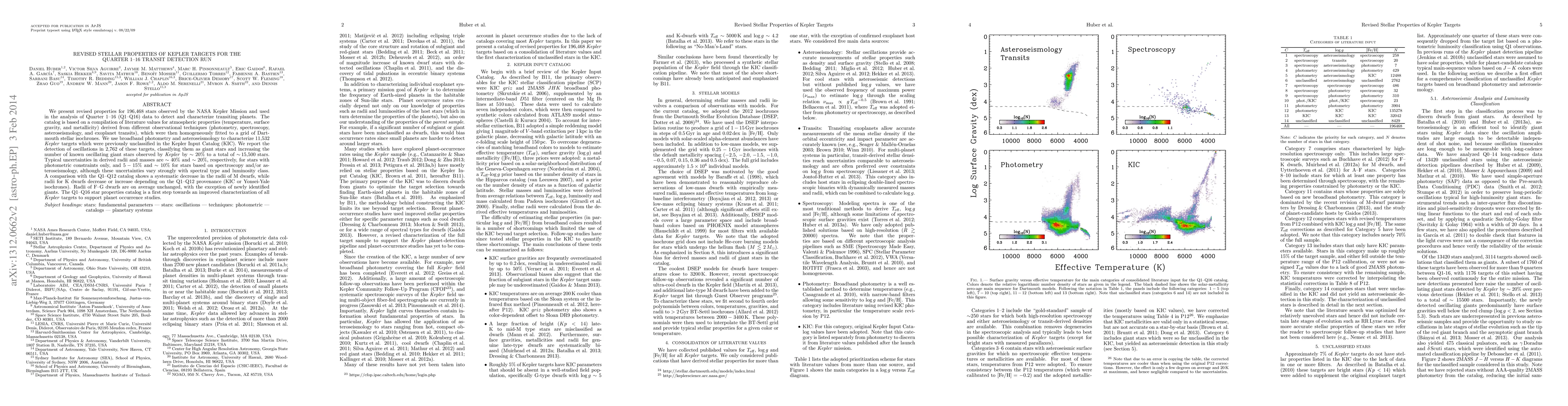 We present revised properties for 196,468 stars observed by the NASA Kepler Mission and used in the analysis of Quarter 1-16 (Q1-Q16) data to detect and characterize transiting exoplanets. The catalog is based on a compilation of literature values for atmospheric properties (temperature, surface gravity, and metallicity) derived from different observational techniques (photometry, spectroscopy, asteroseismology, and exoplanet transits), which were then homogeneously fitted to a grid of Dartmouth stellar isochrones. We use broadband photometry and asteroseismology to characterize 11,532 Kepler targets which were previously unclassified in the Kepler Input Catalog (KIC). We report the detection of oscillations in 2,762 of these targets, classifying them as giant stars and increasing the number of known oscillating giant stars observed by Kepler by ~20% to a total of ~15,500 stars. Typical uncertainties in derived radii and masses are ~40% and ~20%, respectively, for stars with photometric constraints only, and 5-15% and ~10% for stars based on spectroscopy and/or asteroseismology, although these uncertainties vary strongly with spectral type and luminosity class. A comparison with the Q1-Q12 catalog shows a systematic decrease in radii for M dwarfs, while radii for K dwarfs decrease or increase depending on the Q1-Q12 provenance (KIC or Yonsei-Yale isochrones). Radii of F-G dwarfs are on average unchanged, with the exception of newly identified giants. The Q1-Q16 star properties catalog is a first step towards an improved characterization of all Kepler targets to support planet occurrence studies.