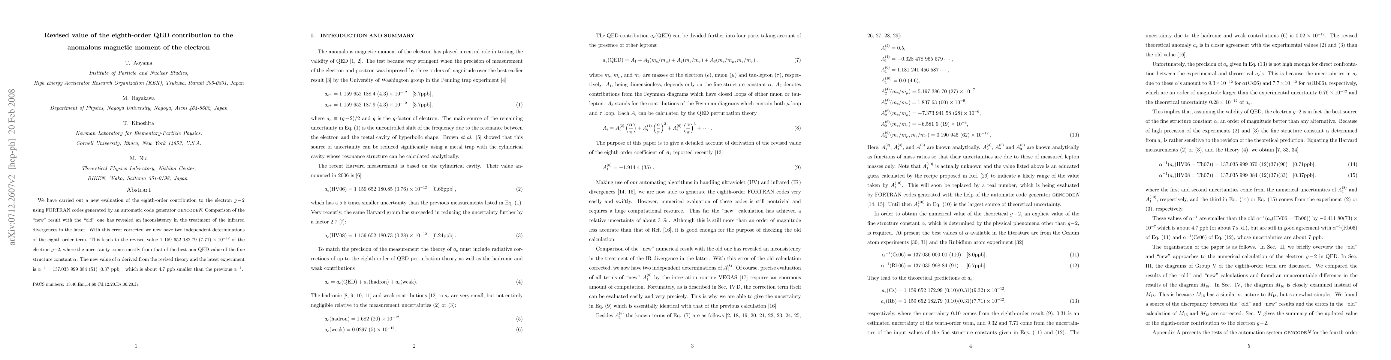 We have carried out a new evaluation of the eighth-order contribution to the electron g-2 using FORTRAN codes generated by an automatic code generator gencodeN. Comparison of the "new" result with the "old" one has revealed an inconsistency in the treatment of the infrared divergences in the latter. With this error corrected we now have two independent determinations of the eighth-order term. This leads to the revised value 1 159 652 182.79 (7.71) x 10^{-12} of the electron g-2, where the uncertainty comes mostly from that of the best non-QED value of the fine structure constant alpha. The new value of alpha derived from the revised theory and the latest experiment is alpha^{-1} = 137.035 999 084 (51) [0.37 ppb], which is about 4.7 ppb smaller than the previous alpha^{-1}.