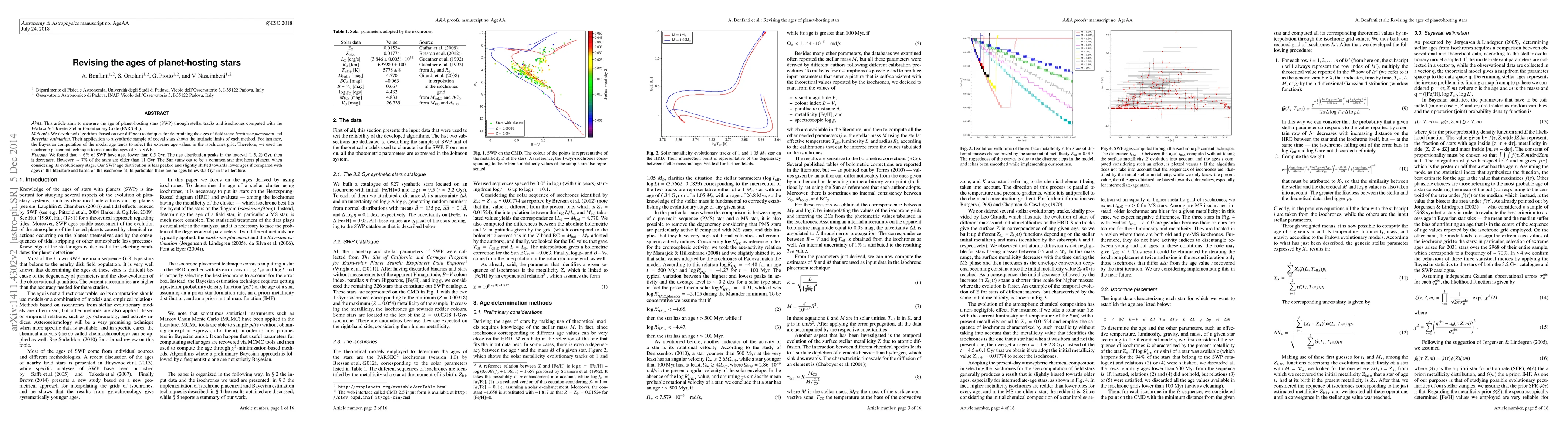This article aims to measure the age of planet-hosting stars (SWP) through stellar tracks and isochrones computed with the \textsl{PA}dova \& T\textsl{R}ieste \textsl{S}tellar \textsl{E}volutionary \textsl{C}ode (PARSEC). We developed algorithms based on two different techniques for determining the ages of field stars: \emph{isochrone placement} and \emph{Bayesian estimation}. Their application to a synthetic sample of coeval stars shows the intrinsic limits of each method. For instance, the Bayesian computation of the modal age tends to select the extreme age values in the isochrones grid. Therefore, we used the isochrone placement technique to measure the ages of 317 SWP. We found that $\sim6\%$ of SWP have ages lower than 0.5 Gyr. The age distribution peaks in the interval [1.5, 2) Gyr, then it decreases. However, $\sim7\%$ of the stars are older than 11 Gyr. The Sun turns out to be a common star that hosts planets, when considering its evolutionary stage. Our SWP age distribution is less peaked and slightly shifted towards lower ages if compared with ages in the literature and based on the isochrone fit. In particular, there are no ages below 0.5 Gyr in the literature.