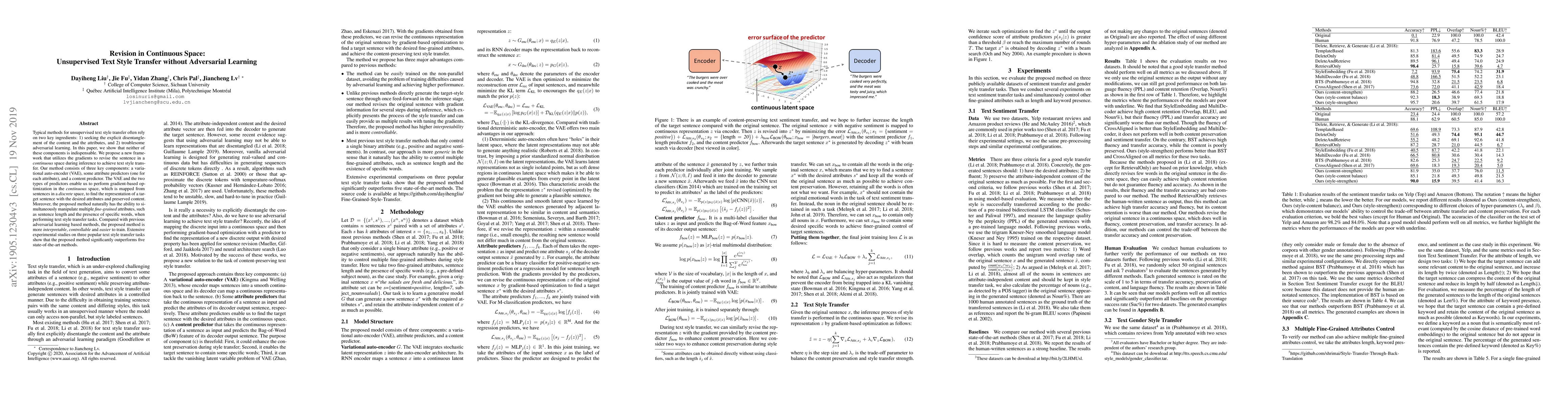 This paper proposes a novel unsupervised text style transfer framework that eliminates the need for adversarial learning and explicit disentanglement of content and attributes. It uses a variational auto-encoder and attribute predictors to perform gradient-based optimization in a continuous space, achieving superior performance over adversarial methods in interpretability, controllability, and training ease.