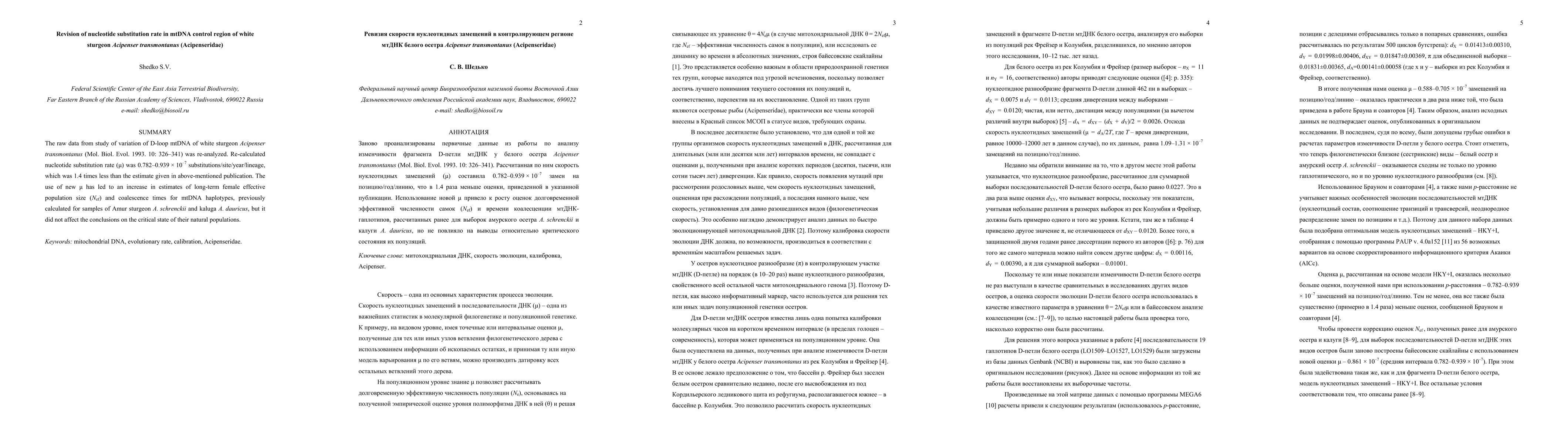 The raw data from study of variation of D-loop mtDNA of white sturgeon Acipenser transmontanus (Mol. Biol. Evol. 1993. 10: 326-341) was re-analyzed. Re-calculated nucleotide substitution rate ({\mu}) was 0.782-0.939 x 10-7 substitutions/site/year/lineage, which was 1.4 times less than the estimate given in above-mentioned publication. The use of new {\mu} has led to an increase in estimates of long-term female effective population size (Nef) and coalescence times for mtDNA haplotypes, previously calculated for samples of Amur sturgeon A. schrenckii and kaluga A. dauricus, but it did not affect the conclusions on the critical state of their natural populations.