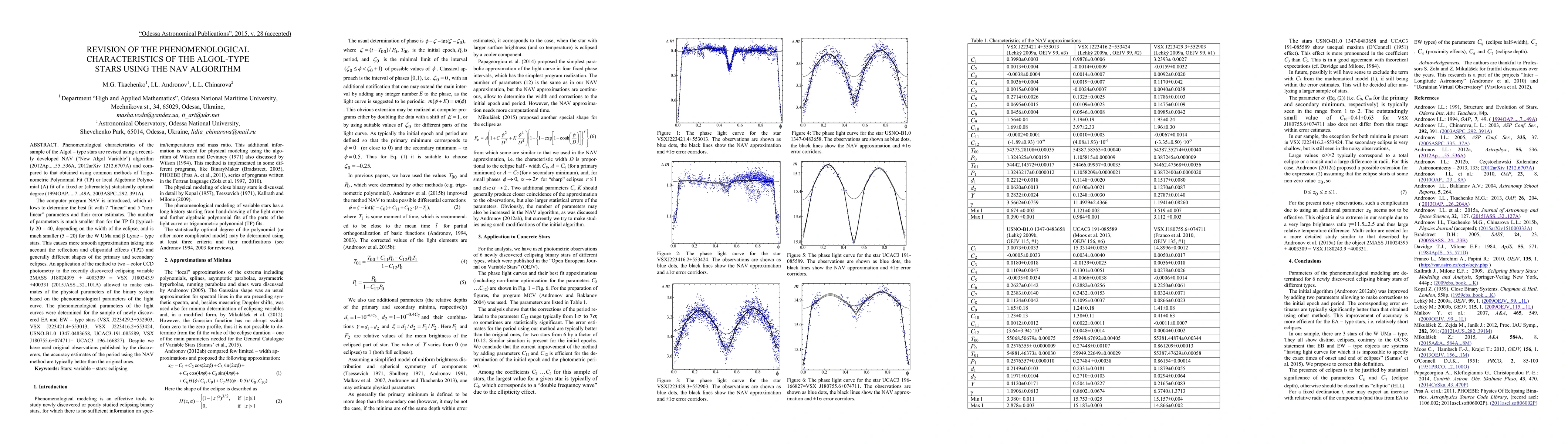 Phenomenological characteristics of the sample of the Algol-type stars are revised using a recently developed NAV ("New Algol Variable") algorithm (2012Ap.....55..536A, 2012arXiv 1212.6707A) and compared to that obtained using common methods of Trigonometric Polynomial Fit (TP) or local Algebraic Polynomial (A) fit of a fixed or (alternately) statistically optimal degree (1994OAP.....7...49A, 2003ASPC..292..391A). The computer program NAV is introduced, which allows to determine the best fit with 7 "linear" and 5 "non-linear" parameters and their error estimates. The number of parameters is much smaller than for the TP fit (typically 20-40, depending on the width of the eclipse, and is much smaller (5-20) for the W UMa and beta Lyrae - type stars. This causes more smooth approximation taking into account the reflection and ellipsoidal effects (TP2) and generally different shapes of the primary and secondary eclipses. An application of the method to two-color CCD photometry to the recently discovered eclipsing variable 2MASS J18024395 + 4003309 = VSX J180243.9 +400331 (2015JASS...32..101A) allowed to make estimates of the physical parameters of the binary system based on the phenomenological parameters of the light curve. The phenomenological parameters of the light curves were determined for the sample of newly discovered EA and EW - type stars (VSX J223429.3+552903, VSX J223421.4+553013, VSX J223416.2+553424, US-NO-B1.0 1347-0483658, UCAC3-191-085589, VSX J180755.6+074711= UCAC3 196-166827). Despite we have used original observations published by the discoverers, the accuracy estimates of the period using the NAV method are typically better than the original ones.