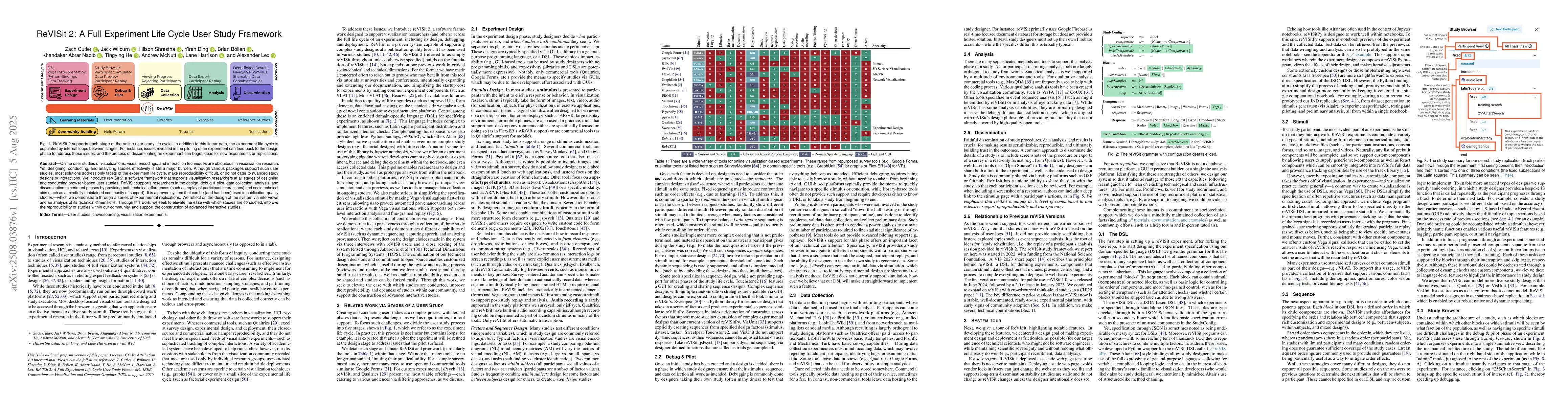 Online user studies of visualizations, visual encodings, and interaction techniques are ubiquitous in visualization research. Yet, designing, conducting, and analyzing studies effectively is still a major burden. Although various packages support such user studies, most solutions address only facets of the experiment life cycle, make reproducibility difficult, or do not cater to nuanced study designs or interactions. We introduce reVISit 2, a software framework that supports visualization researchers at all stages of designing and conducting browser-based user studies. ReVISit supports researchers in the design, debug & pilot, data collection, analysis, and dissemination experiment phases by providing both technical affordances (such as replay of participant interactions) and sociotechnical aids (such as a mindfully maintained community of support). It is a proven system that can be (and has been) used in publication-quality studies -- which we demonstrate through a series of experimental replications. We reflect on the design of the system via interviews and an analysis of its technical dimensions. Through this work, we seek to elevate the ease with which studies are conducted, improve the reproducibility of studies within our community, and support the construction of advanced interactive studies.