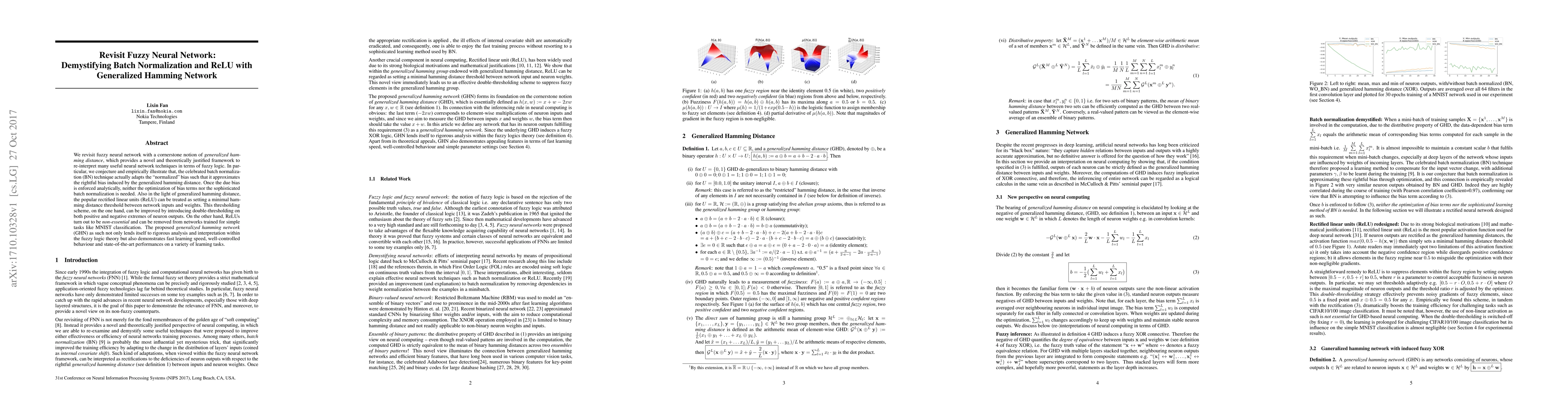 We revisit fuzzy neural network with a cornerstone notion of generalized hamming distance, which provides a novel and theoretically justified framework to re-interpret many useful neural network techniques in terms of fuzzy logic. In particular, we conjecture and empirically illustrate that, the celebrated batch normalization (BN) technique actually adapts the normalized bias such that it approximates the rightful bias induced by the generalized hamming distance. Once the due bias is enforced analytically, neither the optimization of bias terms nor the sophisticated batch normalization is needed. Also in the light of generalized hamming distance, the popular rectified linear units (ReLU) can be treated as setting a minimal hamming distance threshold between network inputs and weights. This thresholding scheme, on the one hand, can be improved by introducing double thresholding on both extremes of neuron outputs. On the other hand, ReLUs turn out to be non-essential and can be removed from networks trained for simple tasks like MNIST classification. The proposed generalized hamming network (GHN) as such not only lends itself to rigorous analysis and interpretation within the fuzzy logic theory but also demonstrates fast learning speed, well-controlled behaviour and state-of-the-art performances on a variety of learning tasks.