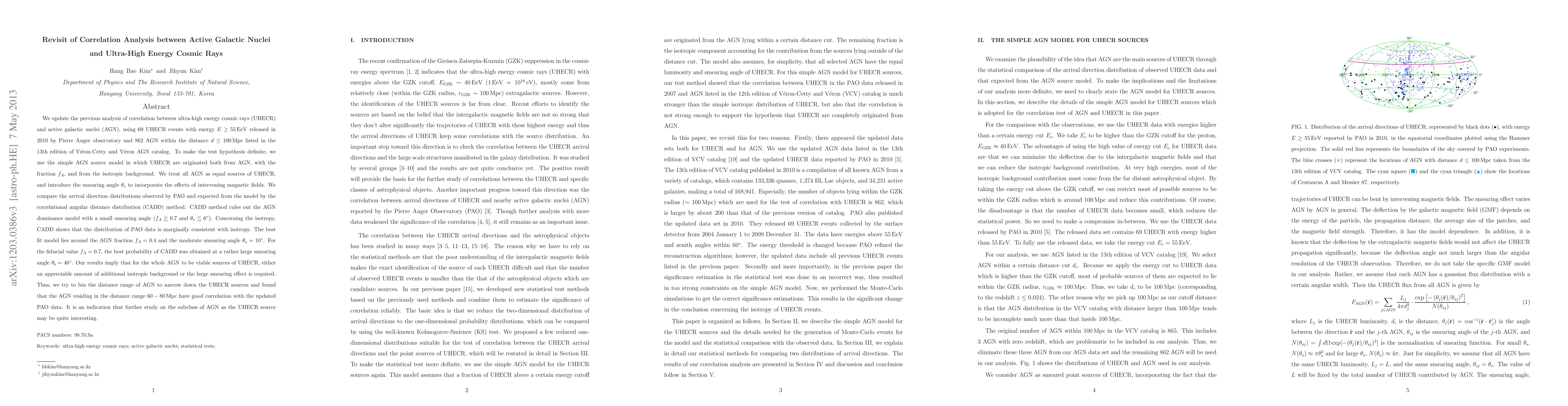 We update the previous analysis of correlation between ultra-high energy cosmic rays (UHECR) and active galactic nuclei (AGN), using 69 UHECR events with energy $E\ge55\,{\rm EeV}$ released in 2010 by Pierre Auger observatory and 862 AGN within the distance $d\le100\,{\rm Mpc}$ listed in the 13th edition of V\'eron-Cetty and V\'eron AGN catalog. To make the test hypothesis definite, we use the simple AGN source model in which UHECR are originated both from AGN, with the fraction $f_A$, and from the isotropic background. We treat all AGN as equal sources of UHECR, and introduce the smearing angle $\theta_s$ to incorporate the effects of intervening magnetic fields. We compare the arrival direction distributions observed by PAO and expected from the model by the correlational angular distance distribution (CADD) method. CADD method rules out the AGN dominance model with a small smearing angle ($f_A\gtrsim0.7$ and $\theta_s\lesssim6^\circ$). Concerning the isotropy, CADD shows that the distribution of PAO data is marginally consistent with isotropy. The best fit model lies around the AGN fraction $f_A=0.4$ and the moderate smearing angle $\theta_s=10^\circ$. For the fiducial value $f_A=0.7$, the best probability of CADD was obtained at a rather large smearing angle $\theta_{\rm s}=46^\circ$. Our results imply that for the whole AGN to be viable sources of UHECR, either an appreciable amount of additional isotropic background or the large smearing effect is required. Thus, we try to bin the distance range of AGN to narrow down the UHECR sources and found that the AGN residing in the distance range $60-80\,{\rm Mpc}$ have good correlation with the updated PAO data. It is an indication that further study on the subclass of AGN as the UHECR source may be quite interesting.