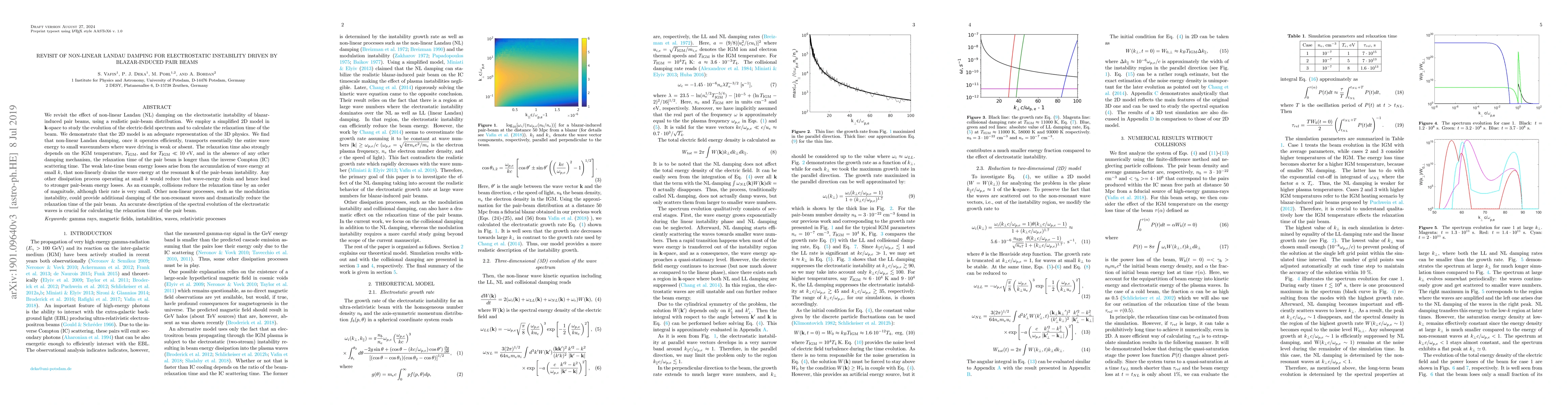 We revisit the effect of non-linear Landau (NL) damping on the electrostatic instability of blazar-induced pair beams, using a realistic pair-beam distribution. We employ a simplified 2D model in ${\bf k}$-space to study the evolution of the electric-field spectrum and to calculate the relaxation time of the beam. We demonstrate that the 2D model is an adequate representation of the 3D physics. We find that non-linear Landau damping, once it operates efficiently, transports essentially the entire wave energy to small wavenumbers where wave driving is weak or absent. The relaxation time also strongly depends on the IGM temperature, $T_\mathrm{IGM}$, and for $T_\mathrm{IGM}\ll10$ eV, and in the absence of any other damping mechanism, the relaxation time of the pair beam is longer than the inverse Compton (IC) scattering time. The weak late-time beam energy losses arise from the accumulation of wave energy at small $k$, that non-linearly drains the wave energy at the resonant $\mathbf{k}$ of the pair-beam instability. Any other dissipation process operating at small $k$ would reduce that wave-energy drain and hence lead to stronger pair-beam energy losses. As an example, collisions reduce the relaxation time by an order of magnitude, although their rate is very small. Other non-linear processes, such as the modulation instability, could provide additional damping of the non-resonant waves and dramatically reduce the relaxation time of the pair beam. An accurate description of the spectral evolution of the electrostatic waves is crucial for calculating the relaxation time of the pair beam.