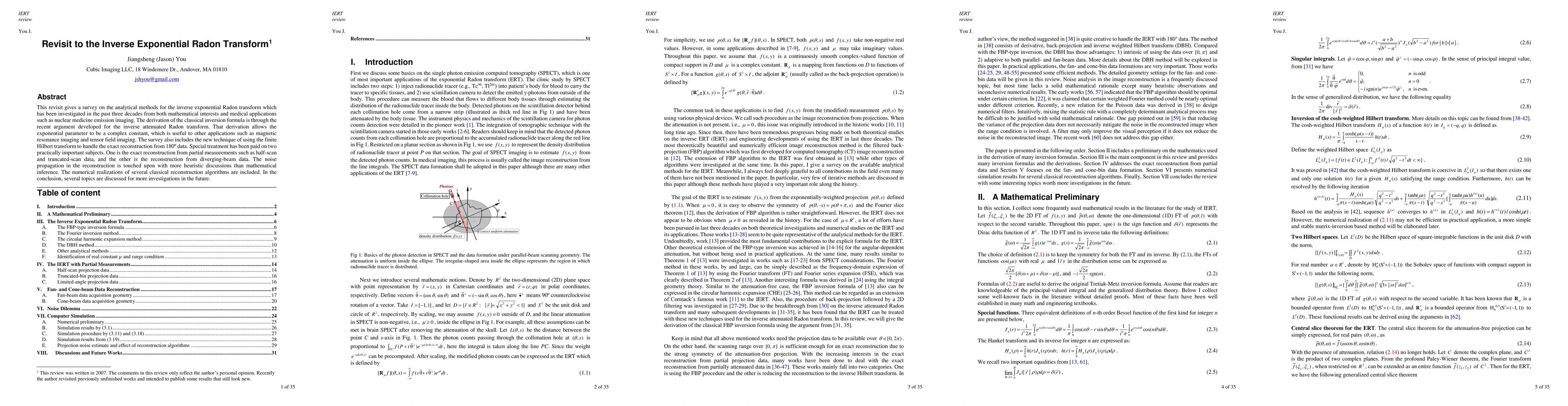 This revisit gives a survey on the analytical methods for the inverse exponential Radon transform which has been investigated in the past three decades from both mathematical interests and medical applications such as nuclear medicine emission imaging. The derivation of the classical inversion formula is through the recent argument developed for the inverse attenuated Radon transform. That derivation allows the exponential parameter to be a complex constant, which is useful to other applications such as magnetic resonance imaging and tensor field imaging. The survey also includes the new technique of using the finite Hilbert transform to handle the exact reconstruction from 180 degree data. Special treatment has been paid on two practically important subjects. One is the exact reconstruction from partial measurements such as half-scan and truncated-scan data, and the other is the reconstruction from diverging-beam data. The noise propagation in the reconstruction is touched upon with more heuristic discussions than mathematical inference. The numerical realizations of several classical reconstruction algorithms are included. In the conclusion, several topics are discussed for more investigations in the future.