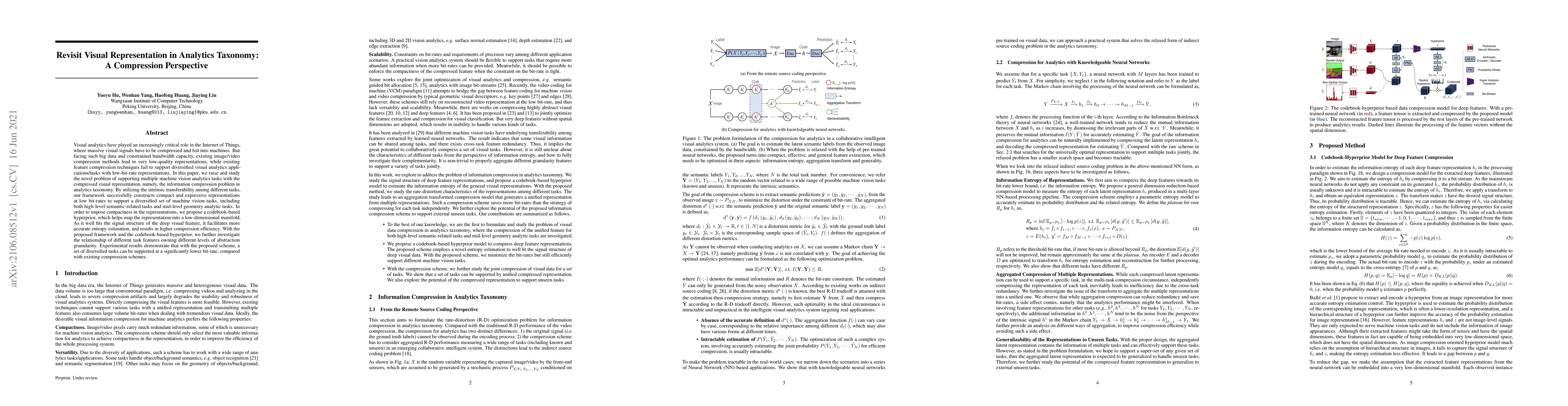 Visual analytics have played an increasingly critical role in the Internet of Things, where massive visual signals have to be compressed and fed into machines. But facing such big data and constrained bandwidth capacity, existing image/video compression methods lead to very low-quality representations, while existing feature compression techniques fail to support diversified visual analytics applications/tasks with low-bit-rate representations. In this paper, we raise and study the novel problem of supporting multiple machine vision analytics tasks with the compressed visual representation, namely, the information compression problem in analytics taxonomy. By utilizing the intrinsic transferability among different tasks, our framework successfully constructs compact and expressive representations at low bit-rates to support a diversified set of machine vision tasks, including both high-level semantic-related tasks and mid-level geometry analytic tasks. In order to impose compactness in the representations, we propose a codebook-based hyperprior, which helps map the representation into a low-dimensional manifold. As it well fits the signal structure of the deep visual feature, it facilitates more accurate entropy estimation, and results in higher compression efficiency. With the proposed framework and the codebook-based hyperprior, we further investigate the relationship of different task features owning different levels of abstraction granularity. Experimental results demonstrate that with the proposed scheme, a set of diversified tasks can be supported at a significantly lower bit-rate, compared with existing compression schemes.