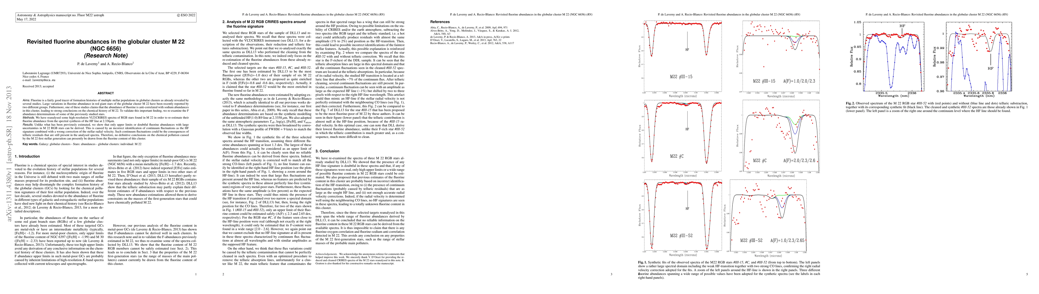 This study re-examines fluorine abundances in M22 globular cluster stars, finding only upper limits or doubtful fluorine abundances due to incorrect continuum identification and radial velocity correction. Thus, no definitive conclusions about the cluster's chemical history can be drawn from fluorine content.