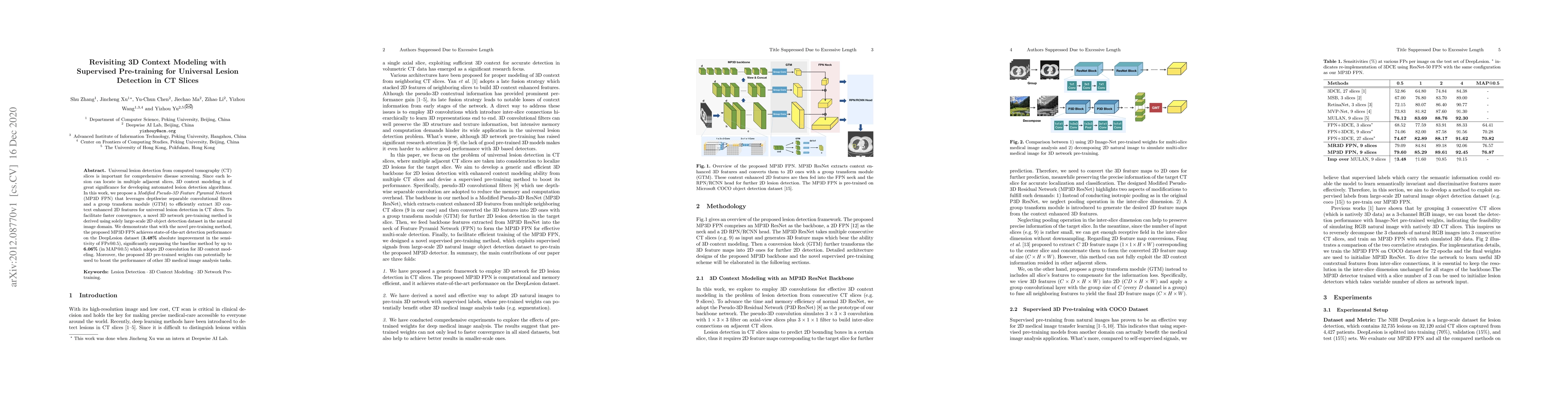 This paper proposes a Modified Pseudo-3D Feature Pyramid Network (MP3D FPN) for universal lesion detection in CT slices, utilizing 3D context modeling and depthwise separable convolutions. It introduces a novel 3D network pre-training method using 2D datasets, achieving state-of-the-art results on the DeepLesion dataset.