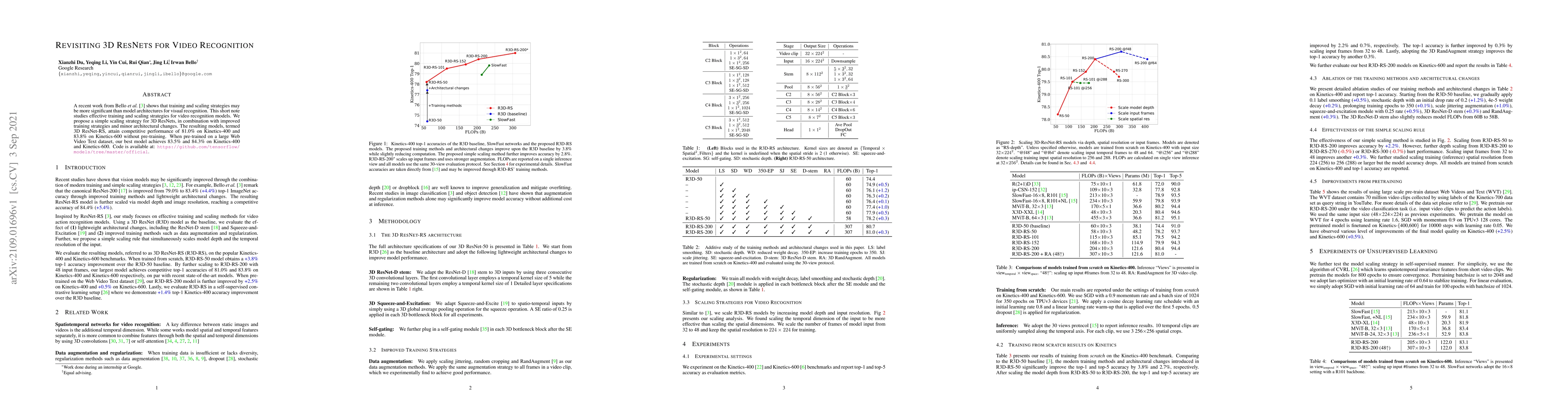 This paper proposes a scaling strategy for 3D ResNets, combined with improved training methods and minor architectural tweaks, achieving competitive performance on Kinetics datasets without pre-training and further gains with pre-training on a large Web Video Text dataset. Code is available for reproducibility.