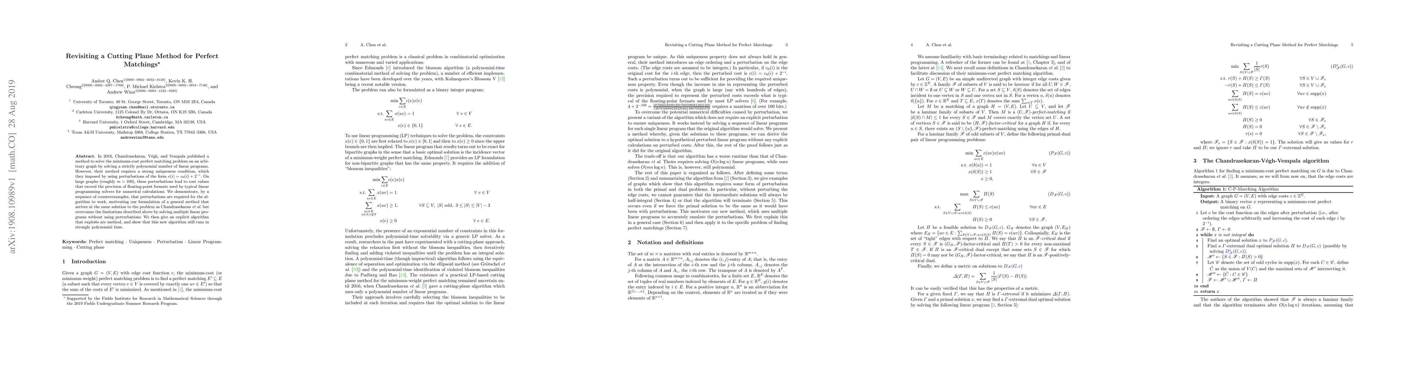 This paper revisits a cutting plane method for solving the minimum-cost perfect matching problem, addressing the limitations of a previous method that relies on perturbations to ensure numerical stability. The new approach solves multiple linear programs without perturbations, maintaining strong polynomial time complexity.