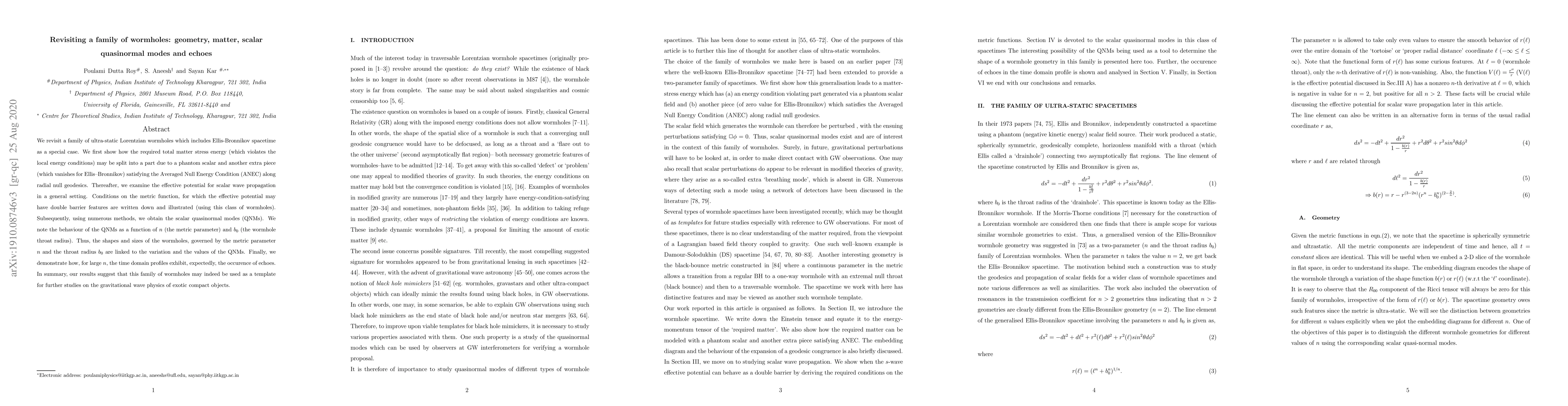 This paper revisits a family of ultra-static Lorentzian wormholes, including Ellis-Bronnikov spacetime, and explores their geometry, matter distribution, and scalar quasinormal modes. It demonstrates how the total matter stress-energy can be decomposed into components satisfying different energy conditions and analyzes the effective potential for scalar wave propagation, linking wormhole geometry to the behavior of quasinormal modes and the occurrence of echoes.