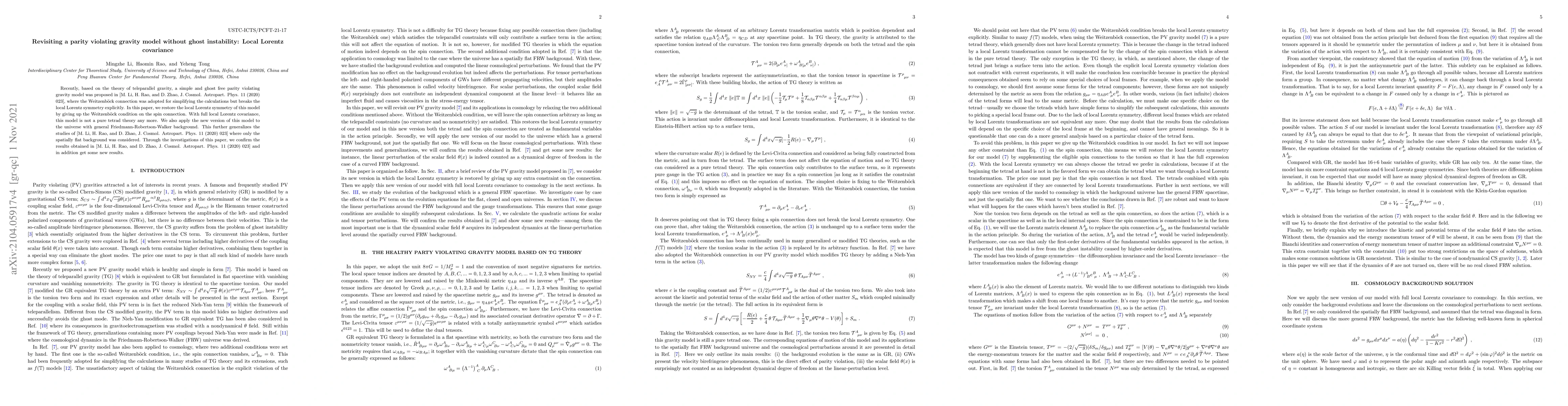 This paper revisits a parity-violating gravity model initially proposed in teleparallel gravity, restoring local Lorentz symmetry by abandoning the Weitzenböck condition on the spin connection. It then applies this revised model to a general Friedmann-Robertson-Walker universe background, confirming previous results and deriving new insights.