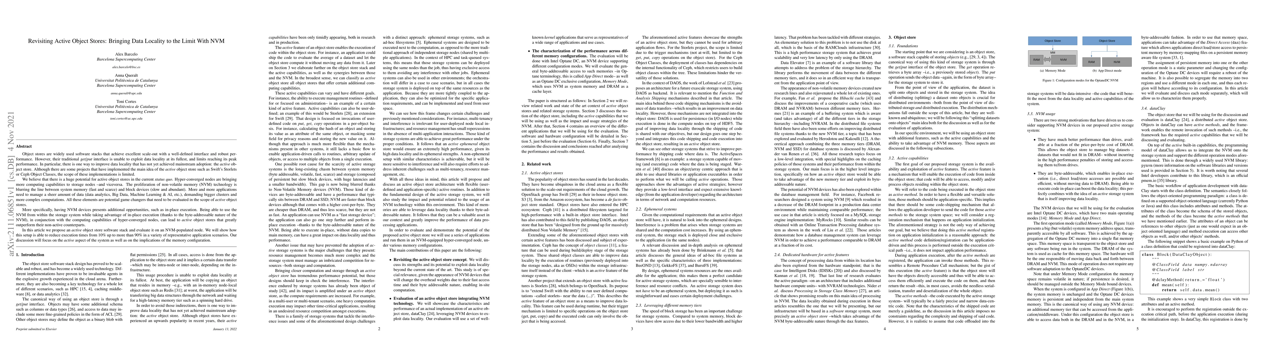 Object stores are widely used software stacks that achieve excellent scale-out with a well-defined interface and robust performance. However, their traditional get/put interface is unable to exploit data locality at its fullest, and limits reaching its peak performance. In particular, there is one way to improve data locality that has not yet achieved mainstream adoption: the active object store. Although there are some projects that have implemented the main idea of the active object store such as Swift's Storlets or Ceph Object Classes, the scope of these implementations is limited. We believe that there is a huge potential for active object stores in the current status quo. Hyper-converged nodes are bringing more computing capabilities to storage nodes --and viceversa. The proliferation of non-volatile memory (NVM) technology is blurring the line between system memory (fast and scarce) and block devices (slow and abundant). More and more applications need to manage a sheer amount of data (data analytics, Big Data, Machine Learning & AI, etc.), demanding bigger clusters and more complex computations. All these elements are potential game changers that need to be evaluated in the scope of active object stores. In this article we propose an active object store software stack and evaluate it on an NVM-populated node. We will show how this setup is able to reduce execution times from 10% up to more than 90% in a variety of representative application scenarios. Our discussion will focus on the active aspect of the system as well as on the implications of the memory configuration.