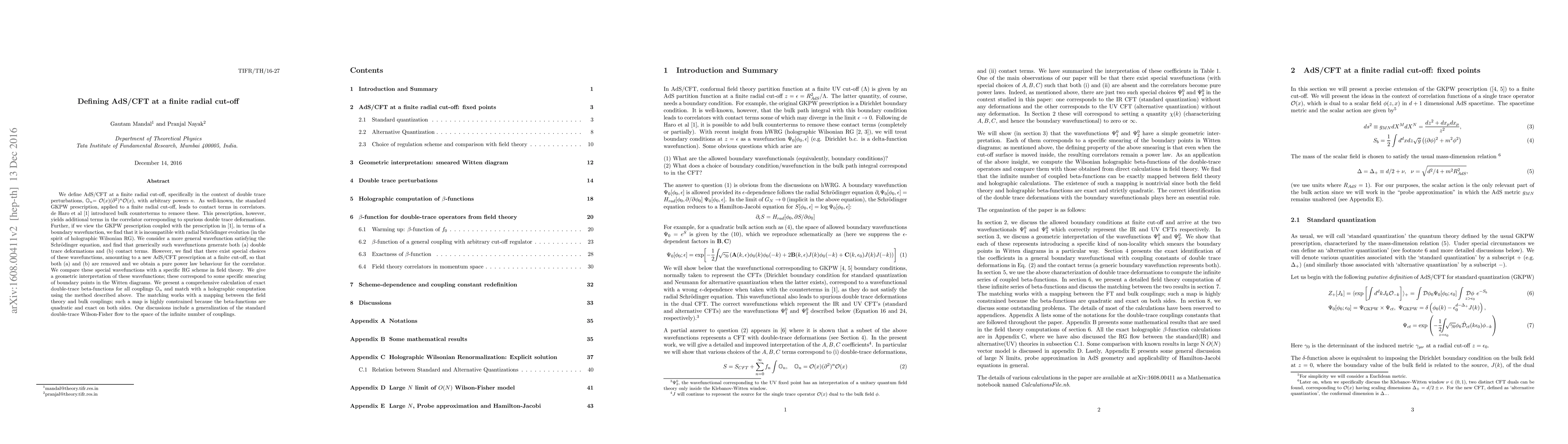 We revisit AdS/CFT at finite radial cut-off, specifically in the context of double trace perturbations, $\mathbb{O}_n$= $\mathbb{O}(x) (\partial^2)^{n} {\mathcal O}(x)$, with arbitrary $n$. As well-known, the standard GKPW prescription, applied to a finite radial cut-off, leads to contact terms in correlators. de Haro et al (arXiv:hep-th/0002230) introduced bulk counterterms to remove these. However, this prescription yields additional terms in the correlator corresponding to spurious double trace deformations. Further, if we view GKPW prescription coupled with the prescription in arXiv:hep-th/0002230, in terms of a boundary wavefunction, we find that it is incompatible with radial Schrodinger evolution (in the spirit of holographic Wilsonian RG). We consider a more general wavefunction satisfying the Schrodinger equation, and find that generically such wavefunctions generate both (a) double trace deformations and (b) contact terms. However, we find that there exist special choices of these wavefunctions, amounting to a new AdS/CFT prescription at a finite cut-off, so that both (a) and (b) are removed and we obtain a pure power law behaviour for the correlator. We compare these special wavefunctions with a specific RG scheme in field theory. We give a geometric interpretation of these wavefunctions; these correspond to some specific smearing of boundary points in the Witten diagrams. We present a comprehensive calculation of exact double-trace beta-functions for all couplings $\mathbb{O}_n$ and match with a holographic computation using the method described above. The matching works with a mapping between the field theory and bulk couplings; such a map is highly constrained because the beta-functions are quadratic and exact on both sides. We generalize standard double-trace Wilson-Fisher flow to the space of the infinite number of couplings.