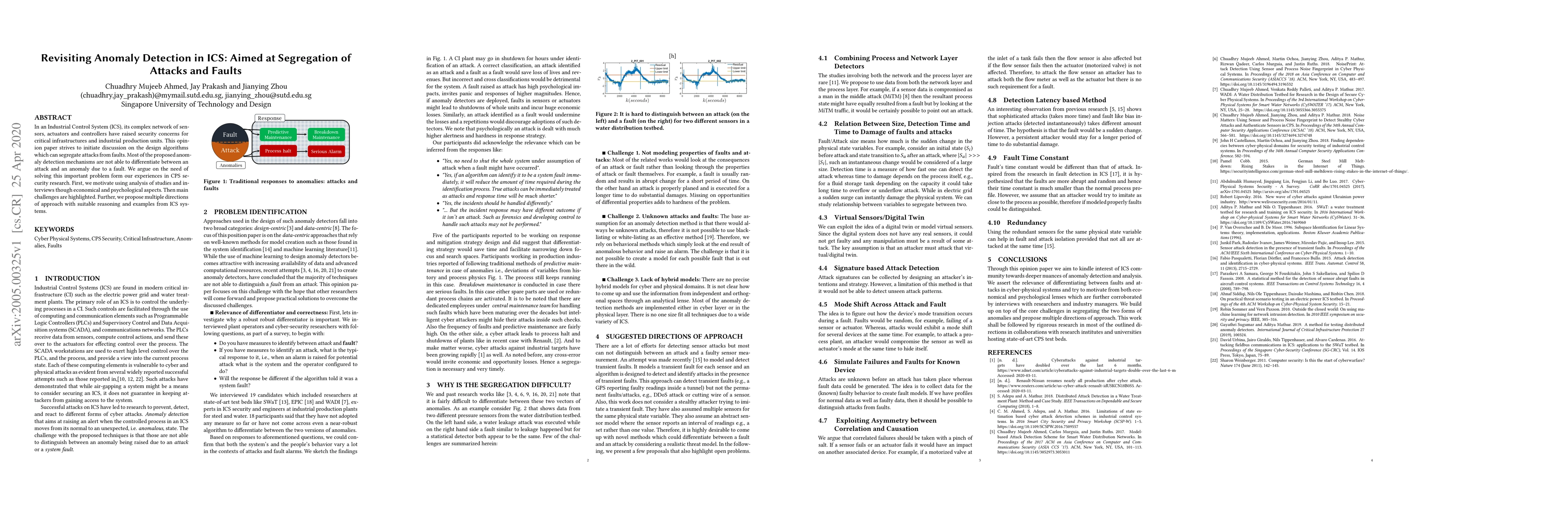 In an Industrial Control System (ICS), its complex network of sensors, actuators and controllers have raised security concerns for critical infrastructures and industrial production units. This opinion paper strives to initiate discussion on the design algorithms which can segregate attacks from faults. Most of the proposed anomaly detection mechanisms are not able to differentiate between an attack and an anomaly due to a fault. We argue on the need of solving this important problem form our experiences in CPS security research. First, we motivate using analysis of studies and interviews though economical and psychological aspects. Then main challenges are highlighted. Further, we propose multiple directions of approach with suitable reasoning and examples from ICS systems.