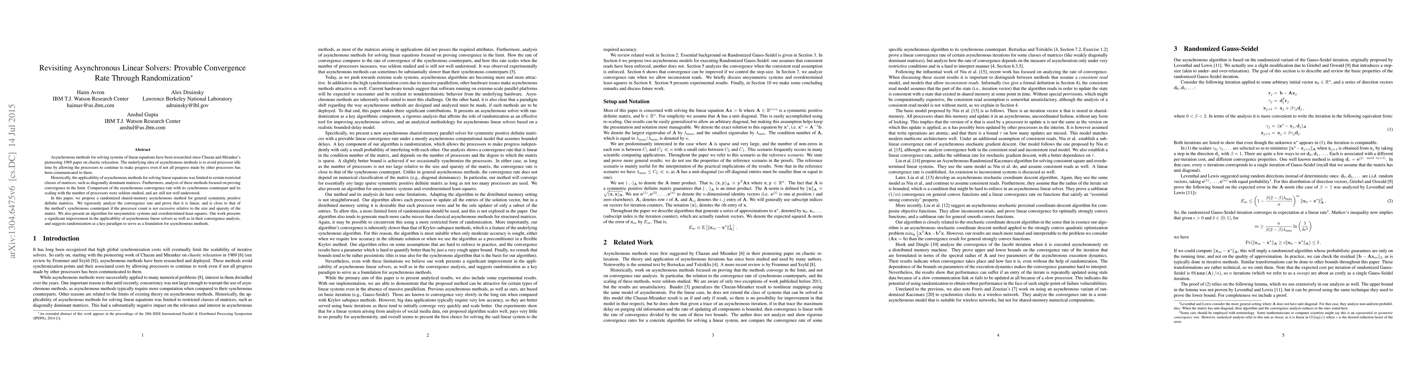 Asynchronous methods for solving systems of linear equations have been researched since Chazan and Miranker's pioneering 1969 paper on chaotic relaxation. The underlying idea of asynchronous methods is to avoid processor idle time by allowing the processors to continue to make progress even if not all progress made by other processors has been communicated to them. Historically, the applicability of asynchronous methods for solving linear equations was limited to certain restricted classes of matrices, such as diagonally dominant matrices. Furthermore, analysis of these methods focused on proving convergence in the limit. Comparison of the asynchronous convergence rate with its synchronous counterpart and its scaling with the number of processors were seldom studied, and are still not well understood. In this paper, we propose a randomized shared-memory asynchronous method for general symmetric positive definite matrices. We rigorously analyze the convergence rate and prove that it is linear, and is close to that of the method's synchronous counterpart if the processor count is not excessive relative to the size and sparsity of the matrix. We also present an algorithm for unsymmetric systems and overdetermined least-squares. Our work presents a significant improvement in the applicability of asynchronous linear solvers as well as in their convergence analysis, and suggests randomization as a key paradigm to serve as a foundation for asynchronous methods.