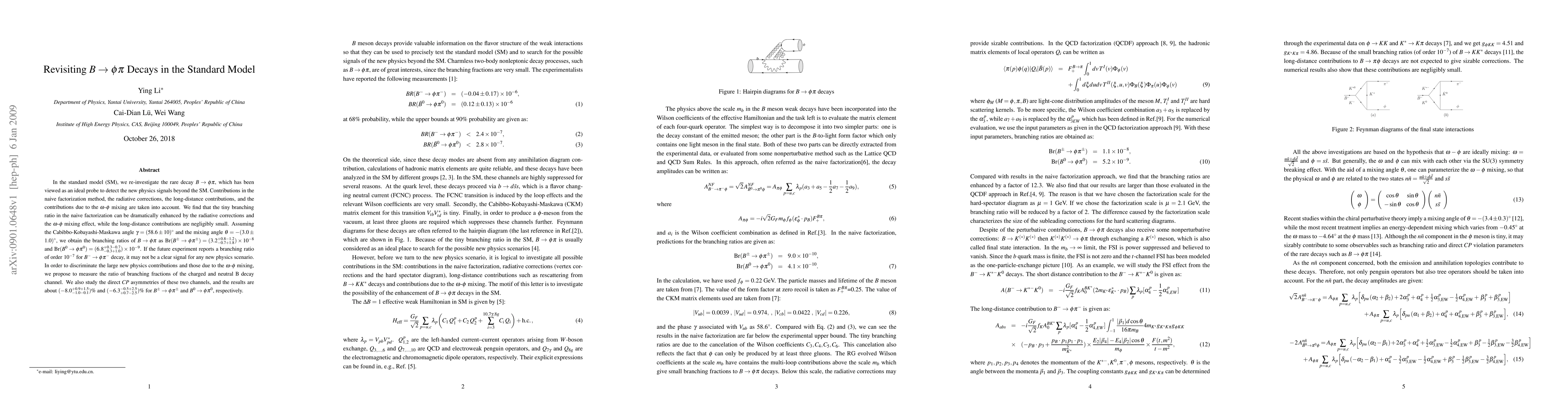 In the standard model (SM), we re-investigate the rare decay $B\to \phi\pi$, which has been viewed as an ideal probe to detect the new physics signals beyond the SM. Contributions in the naive factorization method, the radiative corrections, the long-distance contributions, and the contributions due to the $\omega$-$\phi$ mixing are taken into account. We find that the tiny branching ratio in the naive factorization can be dramatically enhanced by the radiative corrections and the $\omega$-$\phi$ mixing effect, while the long-distance contributions are negligibly small. Assuming the Cabibbo-Kobayashi-Maskawa angle $\gamma=(58.6\pm 10)^\circ$ and the mixing angle $\theta= -(3.0\pm 1.0)^\circ$, we obtain the branching ratios of $B\to \phi\pi$ as $ {\rm Br}(B^\pm\to \phi \pi^\pm)= (3.2 ^{+0.8-1.2}_{-0.7+1.8}) \times 10^{-8}$ and $ {\rm Br}(B^0 \to \phi \pi^0) = (6.8 ^{+0.3-0.7}_{-0.3+1.0}) \times 10^{-9}$. If the future experiment reports a branching ratio of order $10^{-7}$ for $B^-\to \phi \pi^-$ decay, it may not be a clear signal for any new physics scenario. In order to discriminate the large new physics contributions and those due to the $\omega$-$\phi$ mixing, we propose to measure the ratio of branching fractions of the charged and neutral B decay channel. We also study the direct CP asymmetries of these two channels, and the results are about $(-8.0^{+0.9+1.5}_{-1.0-0.1})%$ and $(-6.3^{-0.5+2.5}_{+0.7-2.5})%$ for $B^\pm\to \phi \pi^\pm$ and $B^0 \to \phi \pi^0$, respectively.