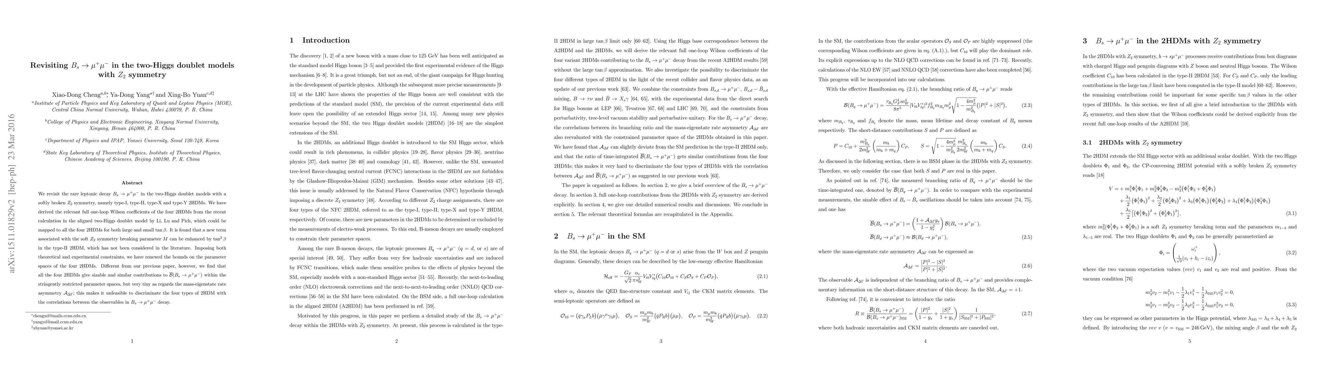This paper revisits the rare decay $B_s \to \mu^+ \mu^-$ in various two-Higgs doublet models (2HDMs) with softly broken $Z_2$ symmetry, deriving new one-loop Wilson coefficients. It finds that type-II 2HDMs can have enhanced contributions by $\tan^2\beta$, leading to similar but small contributions from all four 2HDMs to the decay, making discrimination between them difficult.