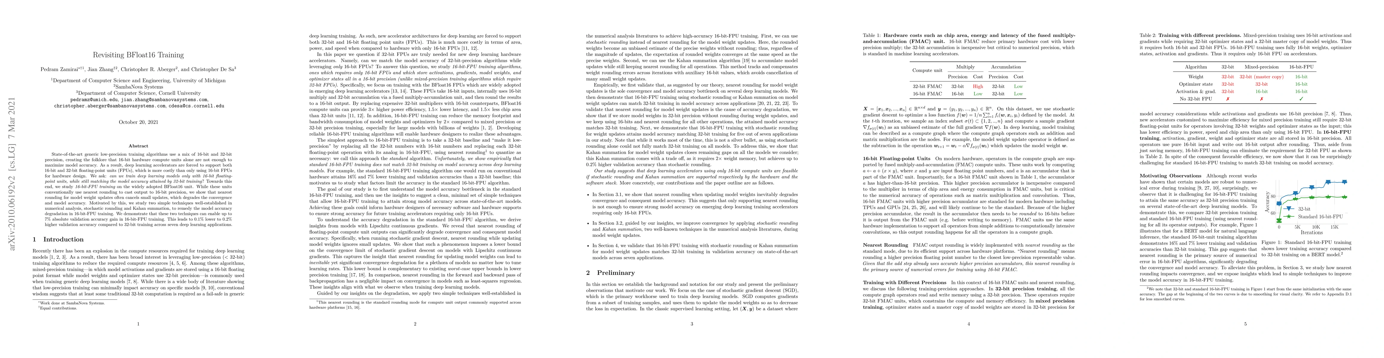State-of-the-art generic low-precision training algorithms use a mix of 16-bit and 32-bit precision, creating the folklore that 16-bit hardware compute units alone are not enough to maximize model accuracy. As a result, deep learning accelerators are forced to support both 16-bit and 32-bit floating-point units (FPUs), which is more costly than only using 16-bit FPUs for hardware design. We ask: can we train deep learning models only with 16-bit floating-point units, while still matching the model accuracy attained by 32-bit training? Towards this end, we study 16-bit-FPU training on the widely adopted BFloat16 unit. While these units conventionally use nearest rounding to cast output to 16-bit precision, we show that nearest rounding for model weight updates often cancels small updates, which degrades the convergence and model accuracy. Motivated by this, we study two simple techniques well-established in numerical analysis, stochastic rounding and Kahan summation, to remedy the model accuracy degradation in 16-bit-FPU training. We demonstrate that these two techniques can enable up to 7% absolute validation accuracy gain in 16-bit-FPU training. This leads to 0.1% lower to 0.2% higher validation accuracy compared to 32-bit training across seven deep learning applications.