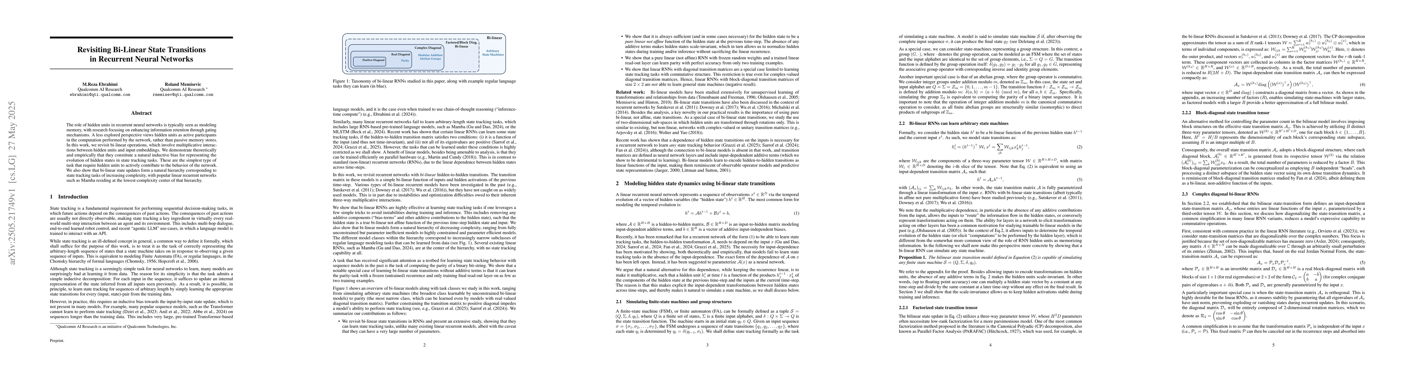 Researchers show that bi-linear state transitions in recurrent neural networks can naturally represent evolving hidden states, forming a hierarchy of complexity with simpler tasks at the bottom.