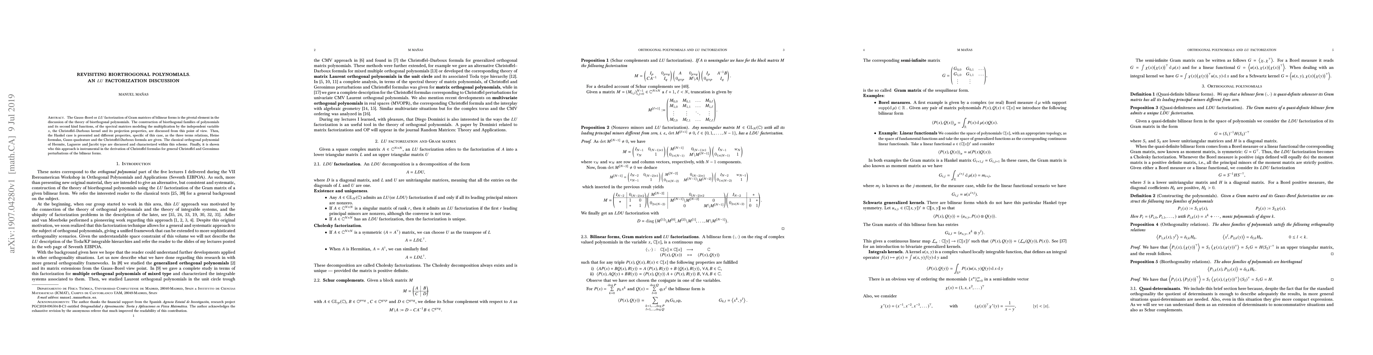 The Gauss-Borel or $LU$ factorization of Gram matrices of bilinear forms is the pivotal element in the discussion of the theory of biorthogonal polynomials. The construction of biorthogonal families of polynomials and its second kind functions, of the spectral matrices modeling the multiplication by the independent variable $x$, the Christoffel-Darboux kernel and its projection properties, are discussed from this point of view. Then, the Hankel case is presented and different properties, specific of this case, as the three terms relations, Heine formulas, Gauss quadrature and the Christoffel-Darboux formula are given. The classical orthogonal polynomial of Hermite, Laguerre and Jacobi type are discussed and characterized within this scheme. Finally, it is shown who this approach is instrumental in the derivation of Christoffel formulas for general Christoffel and Geronimus perturbations of the bilinear forms.