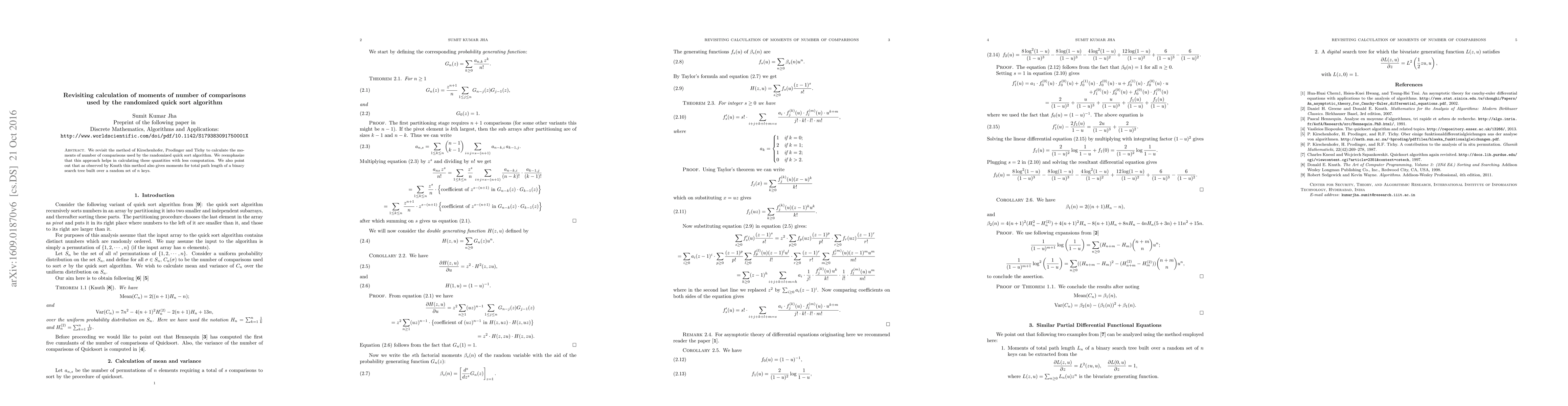 Researchers re-evaluate a method to calculate moments of comparisons used in quick sort algorithm, aiming for more efficient computation and discovering its applicability to binary search tree path lengths.