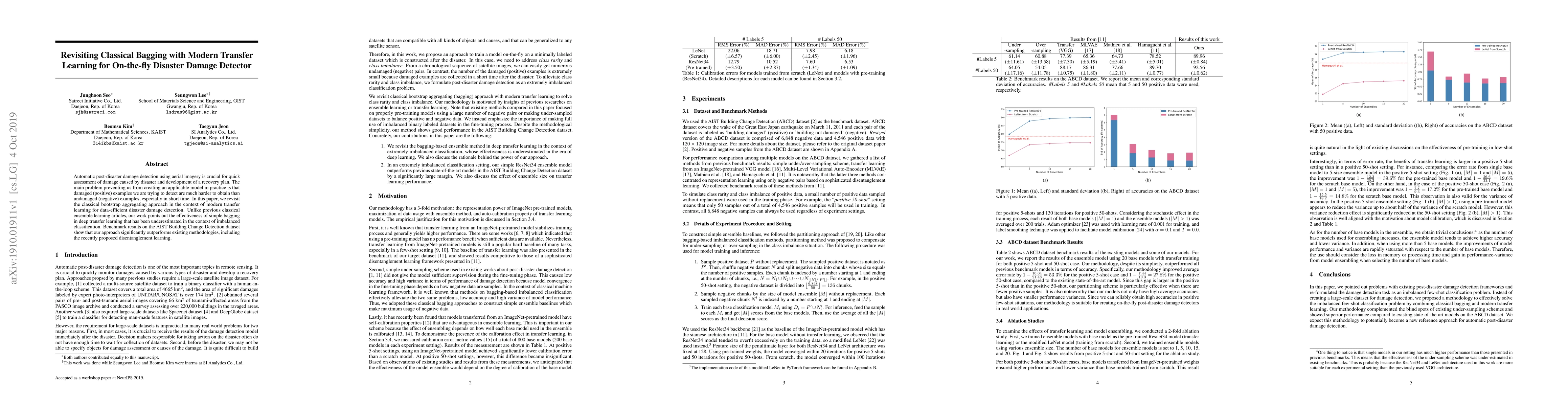 Automatic post-disaster damage detection using aerial imagery is crucial for quick assessment of damage caused by disaster and development of a recovery plan. The main problem preventing us from creating an applicable model in practice is that damaged (positive) examples we are trying to detect are much harder to obtain than undamaged (negative) examples, especially in short time. In this paper, we revisit the classical bootstrap aggregating approach in the context of modern transfer learning for data-efficient disaster damage detection. Unlike previous classical ensemble learning articles, our work points out the effectiveness of simple bagging in deep transfer learning that has been underestimated in the context of imbalanced classification. Benchmark results on the AIST Building Change Detection dataset show that our approach significantly outperforms existing methodologies, including the recently proposed disentanglement learning.