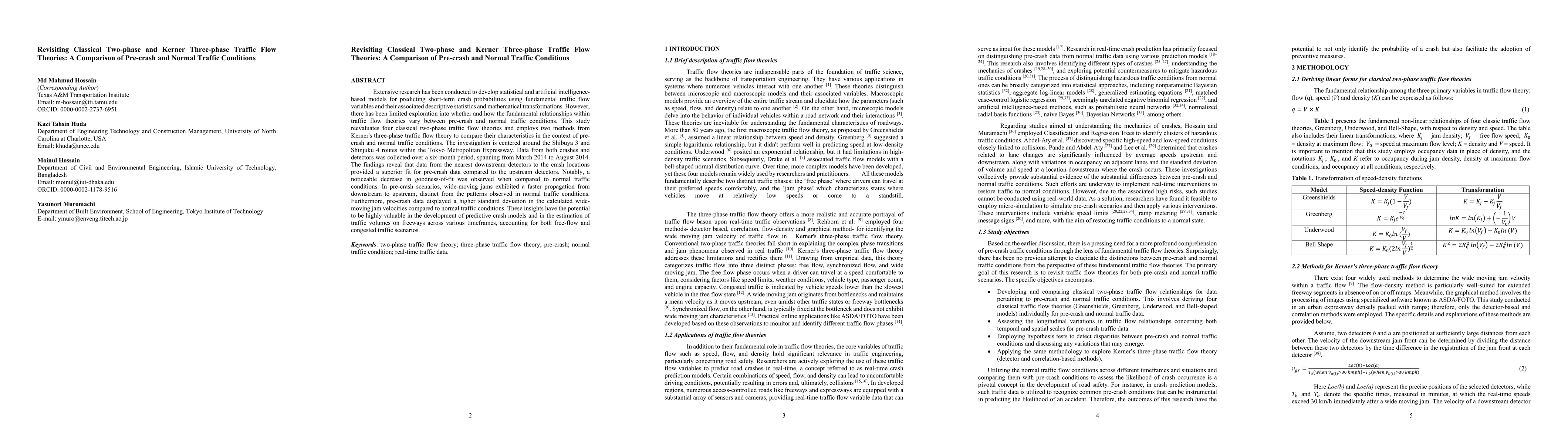 Extensive research has been conducted to develop statistical and artificial intelligence-based models for predicting short-term crash probabilities using fundamental traffic flow variables and their associated descriptive statistics and mathematical transformations. However, there has been limited exploration into whether and how the fundamental relationships within traffic flow theories vary between pre-crash and normal traffic conditions. This study reevaluates four classical two-phase traffic flow theories and employs two methods from Kerner's three-phase traffic flow theory to compare their characteristics in the context of pre-crash and normal traffic conditions. The investigation is centered around the Shibuya 3 and Shinjuku 4 routes within the Tokyo Metropolitan Expressway. Data from both crashes and detectors was collected over a six-month period, spanning from March 2014 to August 2014. The findings reveal that data from the nearest downstream detectors to the crash locations provided a superior fit for pre-crash data compared to the upstream detectors. Notably, a noticeable decrease in goodness-of-fit was observed when compared to normal traffic conditions. In pre-crash scenarios, wide-moving jams exhibited a faster propagation from downstream to upstream, distinct from the patterns observed in normal traffic conditions. Furthermore, pre-crash data displayed a higher standard deviation in the calculated wide-moving jam velocities compared to normal traffic conditions. These insights have the potential to be highly valuable in the development of predictive crash models and in the estimation of traffic volumes on freeways across various timeframes, accounting for both free-flow and congested traffic scenarios.