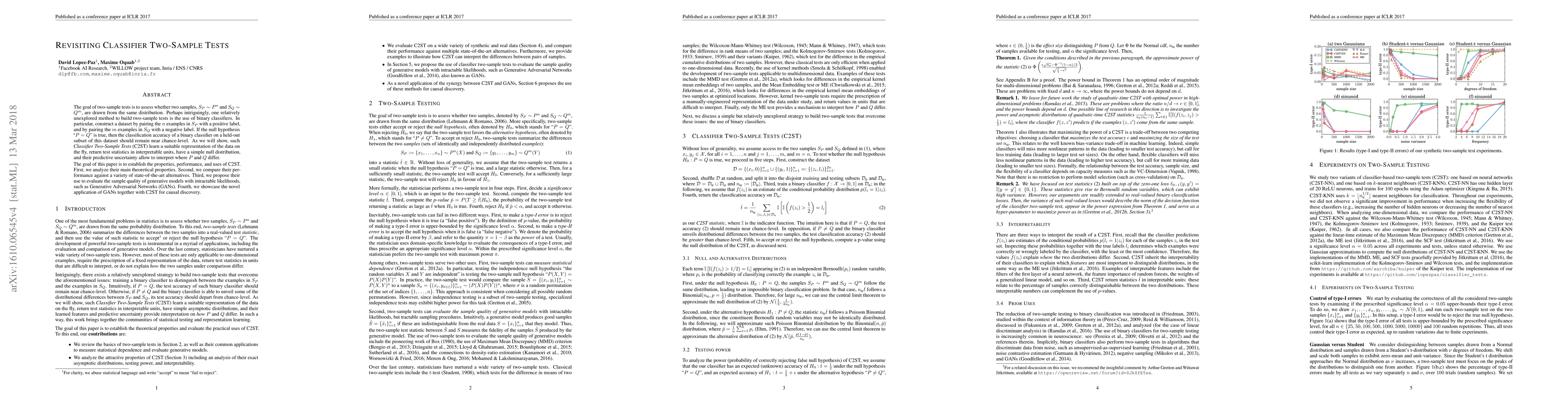 The goal of two-sample tests is to assess whether two samples, $S_P \sim P^n$ and $S_Q \sim Q^m$, are drawn from the same distribution. Perhaps intriguingly, one relatively unexplored method to build two-sample tests is the use of binary classifiers. In particular, construct a dataset by pairing the $n$ examples in $S_P$ with a positive label, and by pairing the $m$ examples in $S_Q$ with a negative label. If the null hypothesis "$P = Q$" is true, then the classification accuracy of a binary classifier on a held-out subset of this dataset should remain near chance-level. As we will show, such Classifier Two-Sample Tests (C2ST) learn a suitable representation of the data on the fly, return test statistics in interpretable units, have a simple null distribution, and their predictive uncertainty allow to interpret where $P$ and $Q$ differ. The goal of this paper is to establish the properties, performance, and uses of C2ST. First, we analyze their main theoretical properties. Second, we compare their performance against a variety of state-of-the-art alternatives. Third, we propose their use to evaluate the sample quality of generative models with intractable likelihoods, such as Generative Adversarial Networks (GANs). Fourth, we showcase the novel application of GANs together with C2ST for causal discovery.