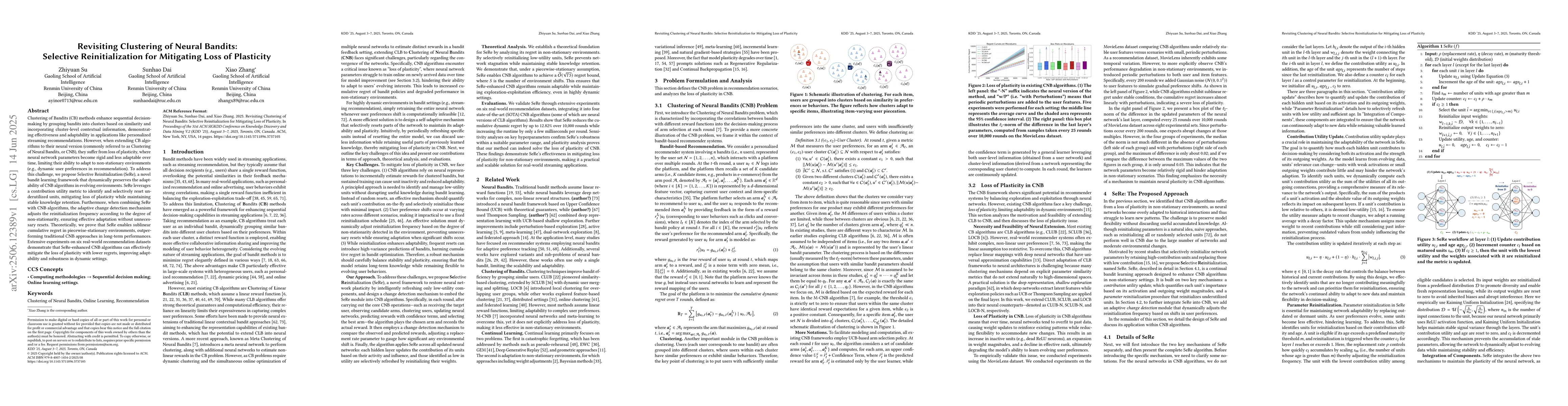Clustering of Bandits (CB) methods enhance sequential decision-making by grouping bandits into clusters based on similarity and incorporating cluster-level contextual information, demonstrating effectiveness and adaptability in applications like personalized streaming recommendations. However, when extending CB algorithms to their neural version (commonly referred to as Clustering of Neural Bandits, or CNB), they suffer from loss of plasticity, where neural network parameters become rigid and less adaptable over time, limiting their ability to adapt to non-stationary environments (e.g., dynamic user preferences in recommendation). To address this challenge, we propose Selective Reinitialization (SeRe), a novel bandit learning framework that dynamically preserves the adaptability of CNB algorithms in evolving environments. SeRe leverages a contribution utility metric to identify and selectively reset underutilized units, mitigating loss of plasticity while maintaining stable knowledge retention. Furthermore, when combining SeRe with CNB algorithms, the adaptive change detection mechanism adjusts the reinitialization frequency according to the degree of non-stationarity, ensuring effective adaptation without unnecessary resets. Theoretically, we prove that SeRe enables sublinear cumulative regret in piecewise-stationary environments, outperforming traditional CNB approaches in long-term performances. Extensive experiments on six real-world recommendation datasets demonstrate that SeRe-enhanced CNB algorithms can effectively mitigate the loss of plasticity with lower regrets, improving adaptability and robustness in dynamic settings.