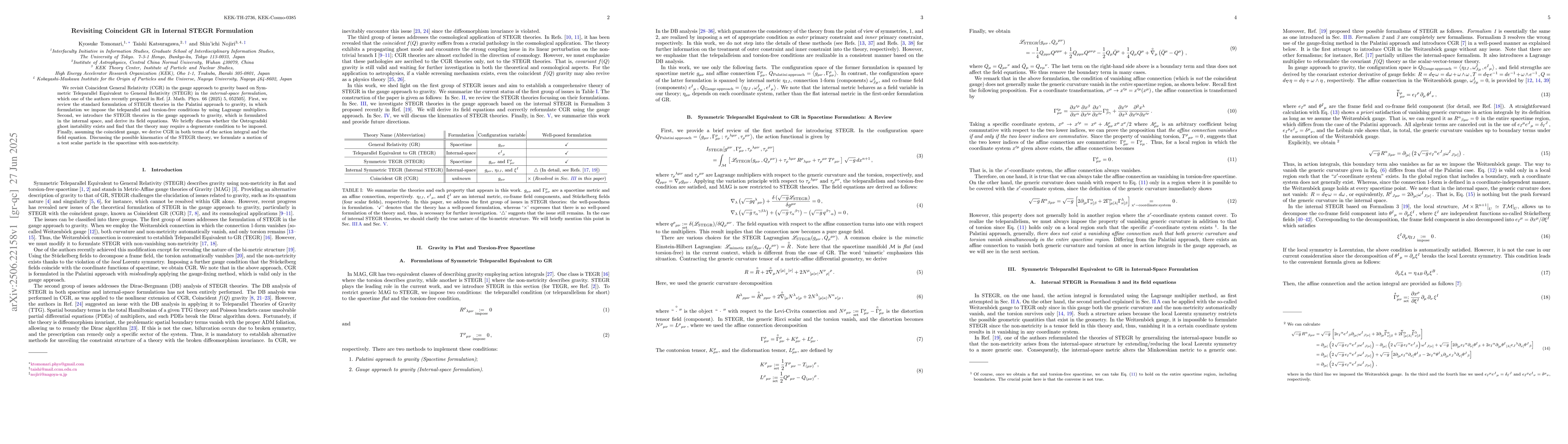 We revisit Coincident General Relativity (CGR) in the gauge approach to gravity based on Symmetric Teleparallel Equivalent to General Relativity (STEGR) in the {\it internal-space formulation}, which one of the authors recently proposed in Ref.~[J. Math. Phys. 66 (2025) 5, 052505]. First, we review the standard formulation of STEGR theories in the Palatini approach to gravity, in which formulation we impose the teleparallel and torsion-free conditions by using Lagrange multipliers. Second, we introduce the STEGR theories in the gauge approach to gravity, which is formulated in the internal space, and derive its field equations. We briefly discuss whether the Ostrogradski ghost instability exists and find that the theory may require a degenerate condition to be imposed. Finally, assuming the coincident gauge, we derive CGR in both terms of the action integral and the field equation. Discussing the possible kinematics of the STEGR theory, we formulate a motion of a test scalar particle in the spacetime with non-metricity.