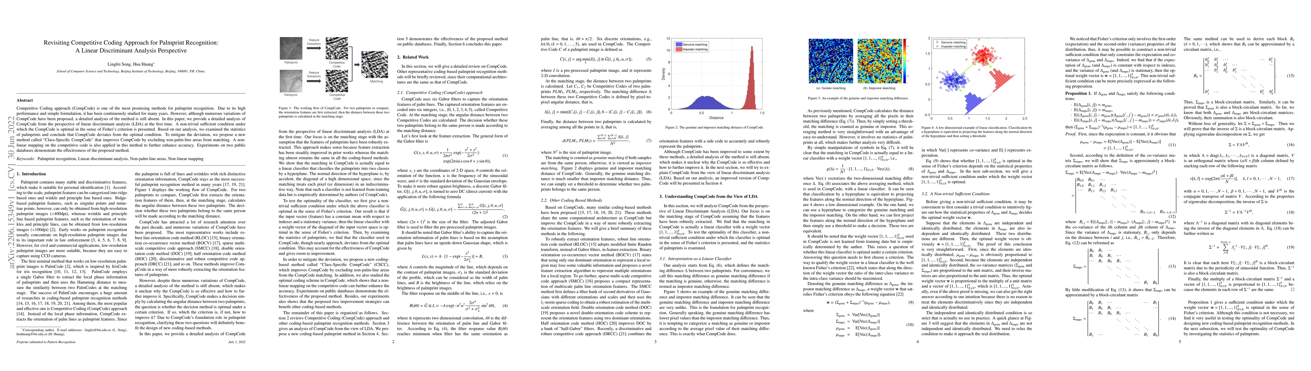 This paper analyzes the Competitive Coding approach for palmprint recognition through the lens of linear discriminant analysis, revealing its deviation from optimal Fisher's criterion conditions. To improve performance, a new Class-Specific CompCode method is proposed, which excludes non-palm-line areas and applies nonlinear competitive code mapping, enhancing accuracy as shown in experiments on public databases.